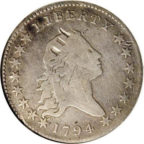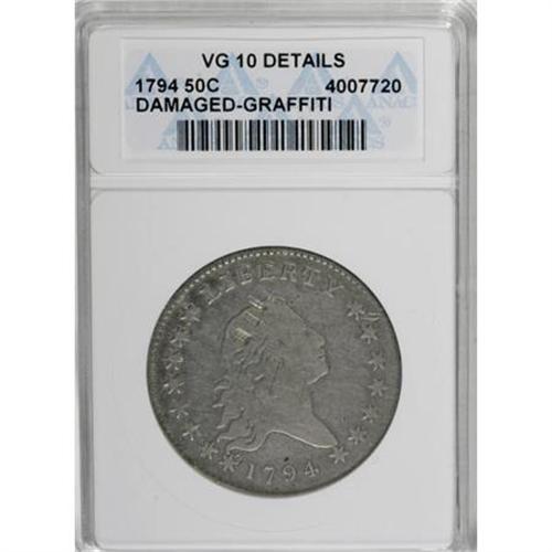 <B>1794 50C --Damaged, Graffiti--ANACS. VG10 Details.</B></I> O-101, R.4. This slate-gray rare date Flowing Hair half has fully outlined stars and bold legends. Some hair and plumage detail remains. Mildly granular and faintly hairlined from a cleaning, and an X within a square is lightly pinscratched on Liberty's upper neck. Three relatively deep marks are noted within the upper hair, and lesser abrasions are present at 2, 7, and 8 o'clock on the obverse and at 10 o'clock on the reverse.<BR><BR><B>Coin Engraver:</B> Robert Scot<BR><BR><b>Shipping:</b> Coins & Currency (<a target="_blank" href="http://www.heritageauctions.com/common/shipping.php">view shipping information</a>)