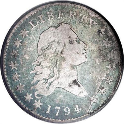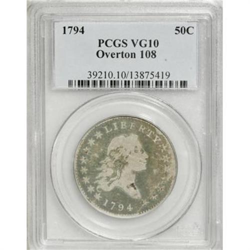 <B>1794 50C VG10 PCGS.</B></I> O-108, R.7. The obverse has a die crack from the border to star 12, the inner points of stars 13 and 14, through star 15, and back to the border. Like the O-106 and O-107 coins in this sale, the reverse die is perfect, showing that this variety was also struck prior to O-101.<BR> Every now and then, a coin comes along that is truly memorable, and this is one such example for the present cataloger. Upon initial examination as part of this collection, I commented to another in our office that I had cataloged this coin several years earlier. In fact, it was late in 2001 when I last saw this piece.<BR> This half dollar is tied for third finest of seven known examples of the variety. The two finer coins grade XF40 and VF20. It has rich turquoise and gold color in the obverse field with light silver devices. The reverse is mostly pale gray with a hint of gold and pale blue around the devices. Both sides have a few minor scratches and rim bumps that require mention, even though they are not of any significance.<BR> Not in Haseltine; Beistle 5-A; Overton 15; Hilt 5-D; PCGS# 6051; Encyclopedia-4550.<BR><I>Ex: Bowers and Merena (11/2001), lot 4002.<BR>From The Westmoreland County Collection of Early Bust Halves, 1794-1807.</B></I><BR><BR><B>Coin Engraver:</B> Robert Scot<BR><BR><b>Shipping:</b> Coins & Currency (<a target="_blank" href="http://www.heritageauctions.com/common/shipping.php">view shipping information</a>)
