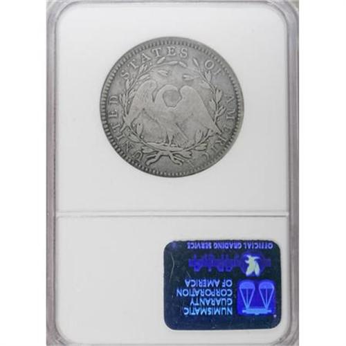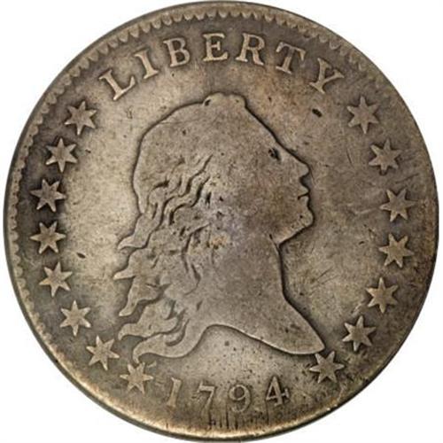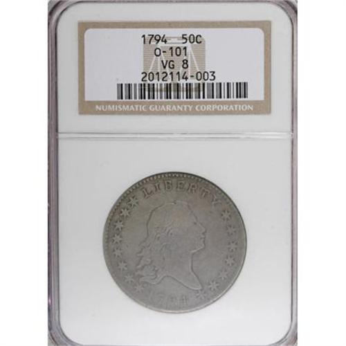 <B>1794 50C VG8 NGC.</B></I> O-101 prime, R.7. This is the earliest die state we have seen, and apparently still Rarity-7 with a perfect reverse die. There appears to be a trace of the crack between D and S with 10x magnification, only between the dentil tips, but this may actually be a faint hairline in that location. Faint die chips are visible above and left of M, and appear to be constant on all die states of this variety, although they were only described for Overton-3 in his first edition. There are no other die defects seen on either side. Martin L. Beistle and Al C. Overton (first edition) describe the crack between D and S for later die states. In the revised edition (1970), Overton notes: "All observed specimens show a die crack from edge to pair of leaves below first S." This same comment is repeated by Donald Parsley in the third and fourth editions. <BR>Pleasing pewter-gray surfaces with a trace of brown on the obverse and deeper steel toning around the devices on the reverse. A few scattered nicks and dents on each side are consistent with the grade. This is a lovely lower-middle grade 1794 half dollar, and extremely important to specialists for its early die state.<BR>Cataloging these coins for the Westmoreland County Collection provides a challenge to present accurate descriptions without over describing the coins. Most of these late 18th and early 19th century coins have served in commerce, some circulating briefly and others extensively, just as they were intended. During their time they were passed from one hand to another, and the coins acquired minor imperfections including tiny nicks, scratches, and other blemishes. While reviewing our descriptions, please remember the typical appearance of these early half dollars. <BR>Beistle recorded this early die state as "Extremely Rare" in 1929, with little change since that time. Although it was not the first 1794 half dollar variety coined at the Mint, this variety is listed first in the current Overton reference due to its similar placement by Haseltine, Beistle, and Overton in his first edition.<BR>Haseltine-1; Beistle 1-A; Overton-1; Hilt 6-D; PCGS# 6051; Encyclopedia-4552. <BR><I>Ex: Sheridan Downey (3/2001).<BR>From The Westmoreland County Collection of Early Bust Halves, 1794-1807.</B></I><BR><BR><B>Coin Engraver:</B> Robert Scot<BR><BR><b>Shipping:</b> Coins & Currency (<a target="_blank" href="http://www.heritageauctions.com/common/shipping.php">view shipping information</a>)