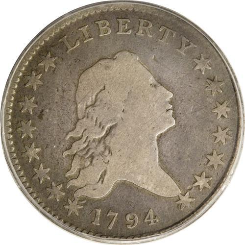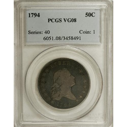 <B>1794 50C VG8 PCGS.</B></I> O-103, High R.5. Even though this is not one of the "impossible" 1794 half dollar varieties, it is clearly a major rarity within the date. In fact, the only 1794 die marriage that can reasonably be classified as a common variety is O-101. There are currently 11 different die combinations known for the date, with a sum total population of just over 500 coins, based on current rarity ratings. Approximately 300 of those are O-101, another 60 are O-104, a further 60 are O-105, and just over 100 pieces represent the other eight varieties combined!<BR> Back to this O-103 die marriage, there are only about 35 to 40 pieces known, given the current High R.5 rarity. Although this example is in lower grade with considerable wear, it could easily be classified as a "perfect" coin for the grade. Other than the usual signs of handling that accompany a well circulated silver piece, the surfaces have natural deep gray color with lighter tan on the devices. The strike is nicely centered on the flan, with strong peripheral details. The eagle is shallow but fully outlined. For the advanced specialist, this offering presents an extremely important opportunity. It appears that this coin is actually a Condition Census candidate, with few finer quality examples known. The finest known example is certified as AU55, and was offered by us in our Platinum Night sale at the January 2007 FUN auction. Next in line are a couple VF grade pieces, a couple more that grade Fine, and then this piece. Most of the higher grade pieces known also have one or more problems from minor to severe. The opportunity to acquire this coin, completely void of such problems, is the stuff of numismatic dreams.<BR><BR><b>Shipping:</b> Coins & Currency (<a target="_blank" href="http://www.heritageauctions.com/common/shipping.php">view shipping information</a>)