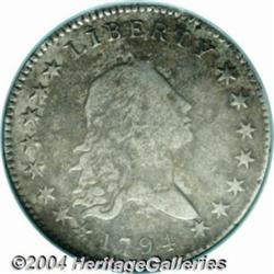 <B>1794<50C> XF Details, Damaged, NCS.</B></I> O-101, R.4. Most easily distinguished by the 10-11 berry arrangement on the reverse, this scarcer variety has deep mottled gray color over both sides with somewhat lighter accents over the highpoints of the devices. A well centered coin, there is evidence of surface porosity and heavy cleaning at one time. An affordable example of this premier first year Half Dollar. <BR><BR><B>Important notice:</B> Heritage usually auctions material at the rate of 200-250 lots per hour. On some occasions eBay Live bid software or the Internet may not be able to keep up with the pace of the auction. We recommend placing a realistic absentee bid now as insurance to avoid disappointment. Occasionally the auctioneer may eliminate or reject an eBay Live bid, and the auctioneer may also reopen a lot after the close of the eBay live bidding (usually because we missed an audience bid), and may reject your bid even if it shows you as the winning bidder. By bidding via eBay Live, you agree that Heritage may award the lot to another bidder at its sole discretion under the circumstances described above or any other reasonable circumstances. Since eBay bids are not shown to us until we open the lot on the floor, we treat those bids just like floor bids. In most cases the floor responds before the eBay bid is presented to us, due to Internet lag time, so for consistency we have made it a policy that floor bids are always considered first over tie eBay live bids. Also please note that all Heritage lots purchased through eBay Live carry a 20% Buyer's Premium. Please make sure you read the Terms and Conditions before you bid. </span></font></tr></table></td></tr></table>