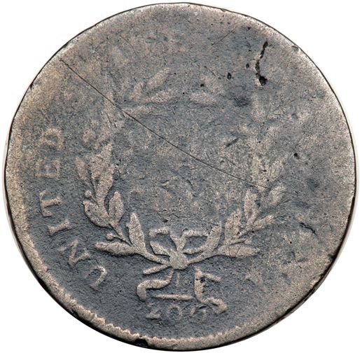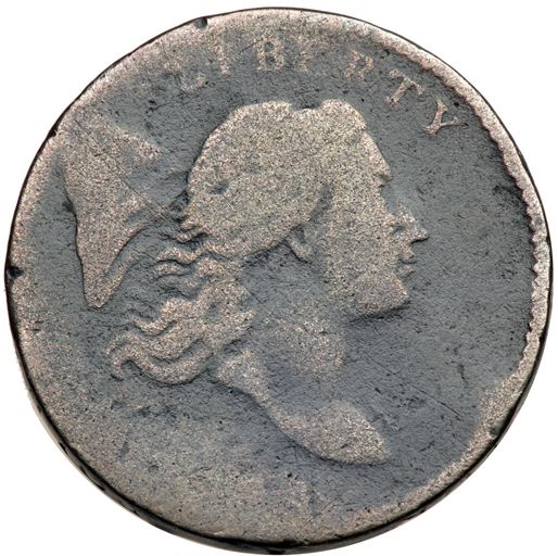1794 C-1a R3 Large Edge Letters AG3. Rotated Reverse. Slightly glossy olive brown with lighter steel brown toning on the devices. The planchet is covered with uniform extremely fine granularity but there is no verdigris. There are a few very light rim bruises and small rim nicks on both sides and a fine pinscratch arcing across the reverse. The date is faint at best but most of the legends remain readable. Struck with the reverse rotated 140 degrees CW relative to a normal head-to-foot die orientation.