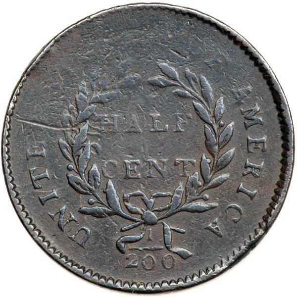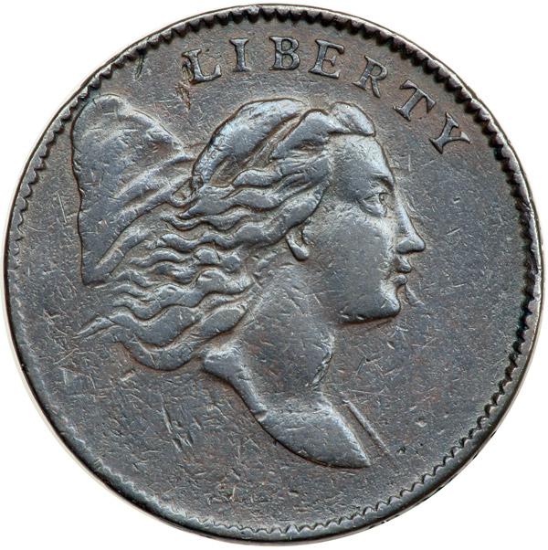 1794 C-1a R3 Liberty Cap, Head Right VF25. Incomplete (Tapered) Planchet. Repunched 179. Large Edge Letters. Breen Plate Coin. Attractive glossy chocolate and steel with frosty slightly lighter steel brown toning in protected areas. No roughness or verdigris, only small marks. Most of the marks are pre-striking planchet chips that didn't smooth out during the strike due to the uneven impression caused by the slightly tapered planchet. As a result the date is missing as is the opposing STATES while the remaining details are clear. Breen calls this a "Tapered Planchet" error, and this piece is plated to illustrate that type of mint error on page 470 of Walter Breen's Encyclopedia of United States Half Cents 1793-1857. The only other marks are a couple small planchet voids left of the L in LIBERTY and a dull scratch through the D in UNITED. LDS, Manley state 3.0. The die clashmarks are clear and the reverse is rotated 30 degrees CCW. An attractive half cent with additional cachet as the Breen plate coin for this type of mint error. Weight 91.8 grains (standard is 104.0 grains). Davy #94.1a.3.