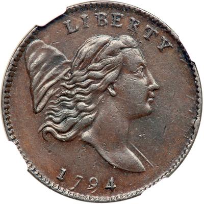 1794 C-1a R3. NGC graded AU-58 Brown. Repunched 179 with Large Edge Letters. Very attractive glossy chocolate and darker steel brown. The planchet is smooth, free of any hint of corrosion or verdigris. Just a few trivial contact marks, including a small rim nick opposite the chin. Perfectly centered on the planchet. MDS, Manley state 2.0, showing light die clashmarks on both sides. The repunching on the 179 remains clear and the reverse is rotated 30 degrees CW from a normal head-to-foot orientation. A very nice example of this popular variety. Our grade is EF40. The attribution is noted on the NGC label. In a new NGC 4 pronged holder. Pop 1; 2 finer, 1 in 62, 1 in 63.