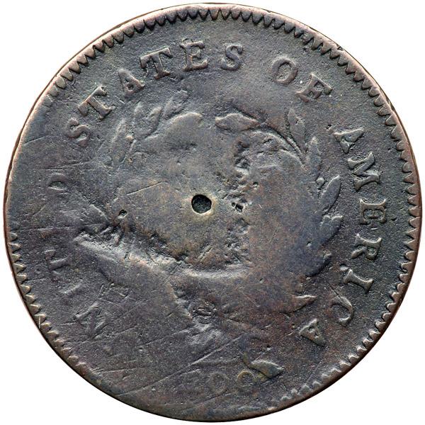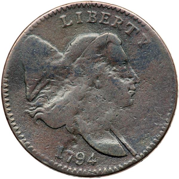 1794 C-2b R6 Large Edge Letters G4. Sharpness VG7 but there are a few dull dents on the portrait that were strong enough to cause bulges at the opposing areas on the reverse. These bulges have obliterated most of HALF CENT and parts of the wreath, but the remainder of the reverse legend remains visible. In addition there is a small punchmark in the center of the reverse. Otherwise the surfaces are smooth and free of notable marks. Glossy olive brown and chocolate with a splash of slightly darker olive brown toning across the upper part of the obverse. The Large Edge Letters are complete and strong. EDS, Manley state 1.0, before the dies clashed. Struck with the dies in a perfect head-to-foot orientation. Listed as CC#8 in the Breen census, CC#7 in the Roger Cohen list. Noyes photo #73646. Weight 106.9 grains.