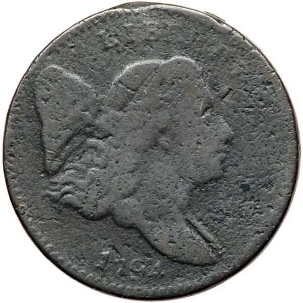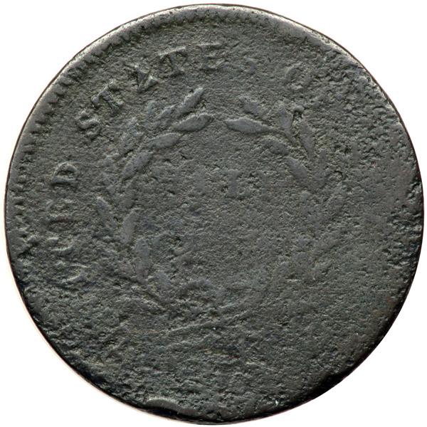 1794 C-2c R7+ Liberty Cap, Head Right with Plain (Unlettered) Edge G5. Missing Edge Letters. Sharpness several points better where properly struck up but the planchet is covered with fine porosity. No verdigris. The only notable marks are dull rim nicks at IB in LIBERTY and below the left edge of the fraction. Dark steel brown with gloss on the devices but relatively matte in the protected areas. The date is clear and most of the legend is clear as well, although AMERICA is missing due to an uneven strike. EDS, Manley state 1.0, with the reverse rotated 15 degrees CW. The edge lettering is missing (planchet failed to pass through the Castaing machine). Similar to the 1794 C-1c listed earlier. An extremely rare mint error rather than a separate die variety; only one other example is known to this cataloger (McCawley & Grellman Auctions 1/6/1996:57). Weight 97.5 grains. Davy #94.2.3.