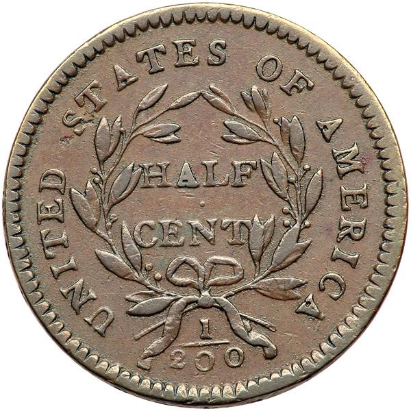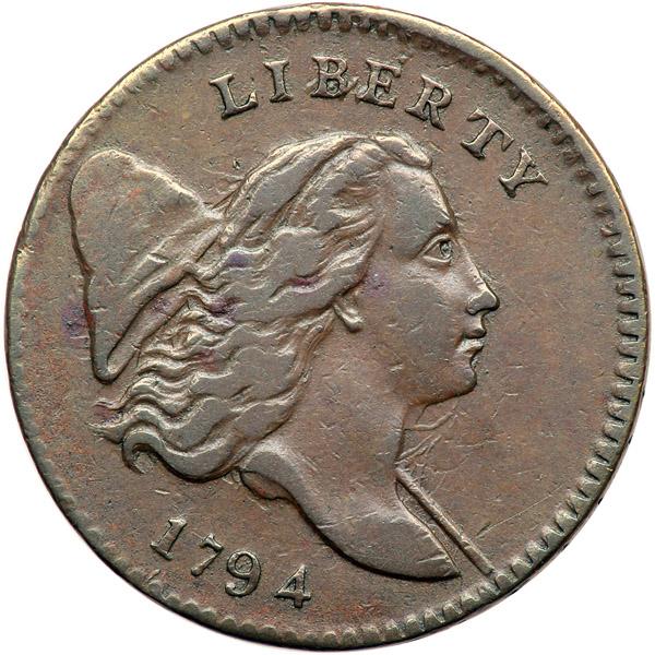 1794 C-3a R5 Small Edge Letters VF25+. Beautiful glossy medium brown with slightly darker steel brown toning on the highpoints. The planchet is smooth and the surfaces are outstanding. The only marks, and they are trivial, are a couple small splashes of reddish brown toning on the cap and hair, a faint hairline in the field above the end of the pole, and a barely visible rim bruise under the right end of the fraction. MDS, Manley state 2.0, showing a faint bulge in the field right of the date and the reverse rotated 75 degrees clockwise from the normal head-to-foot orientation. This piece is plated in the Breen encyclopedia to illustrate the Very Fine grade (page 49) and again on page 108 to illustrate his die state I for the variety. This is a very attractive example of a tough die variety. Listed as CC#4 in the Mike Spurlock census, CC#3 in the Frank Wilkinson list, and CC#3 in the Breen list. Noyes photo #73602. Weight 101.9 grains.