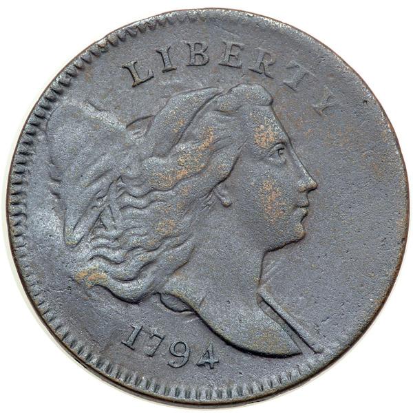 1794 C-4a R3 F12. Small Edge Letters. Sharpness near EF40 but the planchet is dull and covered with uniform microscopic roughness. No contact marks or verdigris. The best identifying feature of this piece is a slightly beveled planchet at the rim over UNI. Frosty dark steel and olive with slightly lighter chocolate toning on the highpoints of the obverse. Sharply struck M-LDS, Manley state 3.0. The die clashmarks are sharp and the bulge under the cap is strong. Weight 105.2 grains.