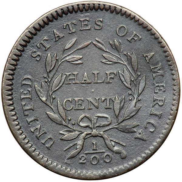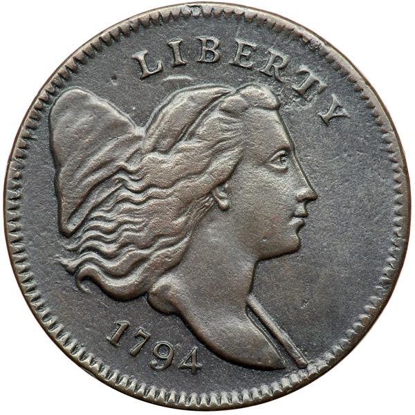 1794 C-4a R3 Small Edge Letters VF25. Sharpness EF40 but there is a very subtle dent under the M in AMERICA that caused an equally subtle bulge in the field above the end of the pole. Otherwise the only marks are a tiny chip out of the rim over the B in LIBERTY and another in the field left of that L. Very nicely recolored glossy dark chocolate brown and olive. This piece offers excellent eye appeal in spite of the imperfections. EDS, Manley state 1.0, prior to the die clashmarks on the obverse. The reverse is rotated 15 degrees CCW. Plated in the Manley book to illustrate his die state 1.0. Noyes photo #73638. Weight 103.4 grains.
