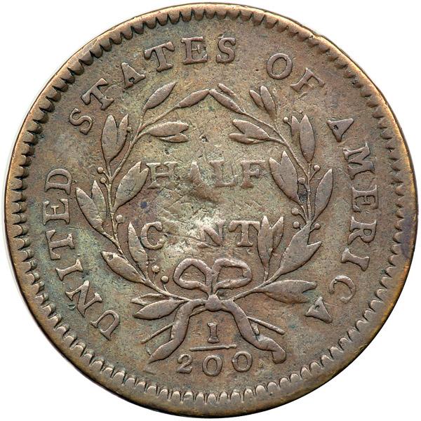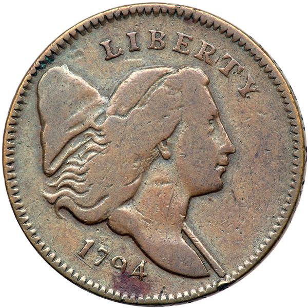 1794 C-4b R7 Large Edge Letters VG8+. Glossy light to medium brown blending to light chocolate brown on the devices. The surfaces are smooth and the only notable marks are a small splash of reddish chocolate toning under the 94, a small rim nick at the end of the pole, and a shallow low spot (incomplete planchet) at the top of EN in CENT. Very close to VG10. The date and legends are strong except for weakness at E in CENT thanks to the low spot in the planchet. The Large Edge Letters are complete and clear. EDS, Manley state 1.0, without any die clashmarks on the obverse. The reverse is rotated 15 degrees CCW. A nice example of a very important variety that is missing from most advanced collections, tied for CC#5 in the Mike Spurlock census. Noyes photo #73664. Weight 100.1 grains.