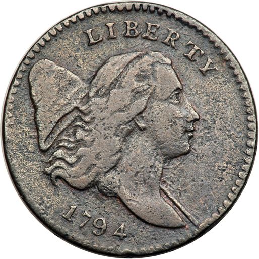 1794 C-5a R4+ Small Edge Letters VG8. Sharpness F15 with uniform fine roughness covering the planchet. No verdigris, and the only notable mark is a tiny rim bruise at the end of the pole. Slightly glossy dark olive and steel. The date is bold and the legends are clear. LDS, Manley state 2.0, which he calls "very rare." The reverse is rotated 30 degrees CW. Weight 104.0 grains.