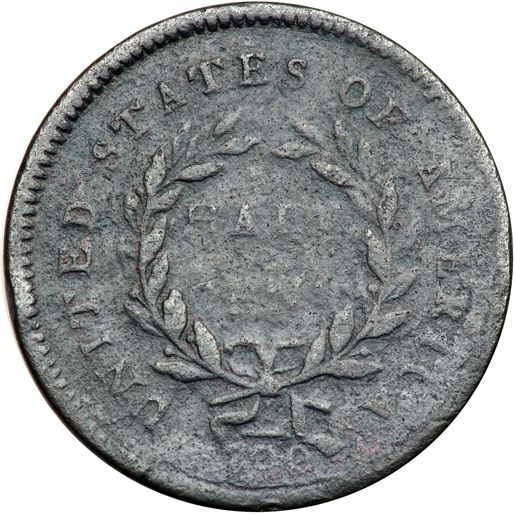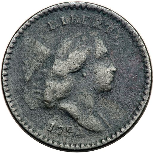 1794 C-8 R5 G6. Sharpness near F15 but covered with fine roughness under a slightly glossy dark olive and steel patina. The highpoints are a lighter shade of chocolate brown. No verdigris. A small rim bruise at TE in UNITED is the only significant mark. The date and legends are complete and easily readable. E-MDS, Manley state 2.0 early. The die crack down through the second T in STATES is faint.