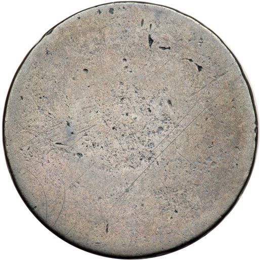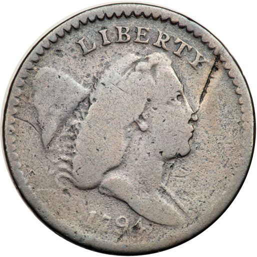 1794 C-9 R2 AG3. The obverse is a couple points better while the reverse is considerably weaker showing only faint details but enough to be certain of the attribution. Lightly cleaned and retoned glossy steel and chocolate brown. No roughness or verdigris. The only mark is an obvious planchet fissure from the dentils right of Y down to the nose, and this fissure was lightly scraped to minimize its impact (didn't work). MDS, Manley state 2.0. Weight 96.7 grains.