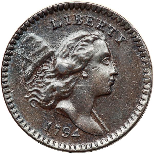 1794 C-9 R2 EF40. Choice glossy chocolate and olive brown. Smooth and very attractive, nearly flawless. A pair of tiny nicks under the left corner of the eye, a very faint scuff that barely alters the chocolate toning on the cheek, and a spot of darker toning at the dentils over the F in OF are the best identifying marks. What may appear to be tiny rim bruises around the reverse are actually strongly impressed edge letters. M-LDS, Manley state 3.0. The die crack from the rim into the cap is strong and the tiny rim cud just left of the fraction is clear. A beautiful 1794 half cent.