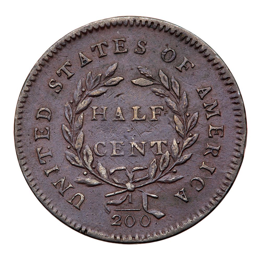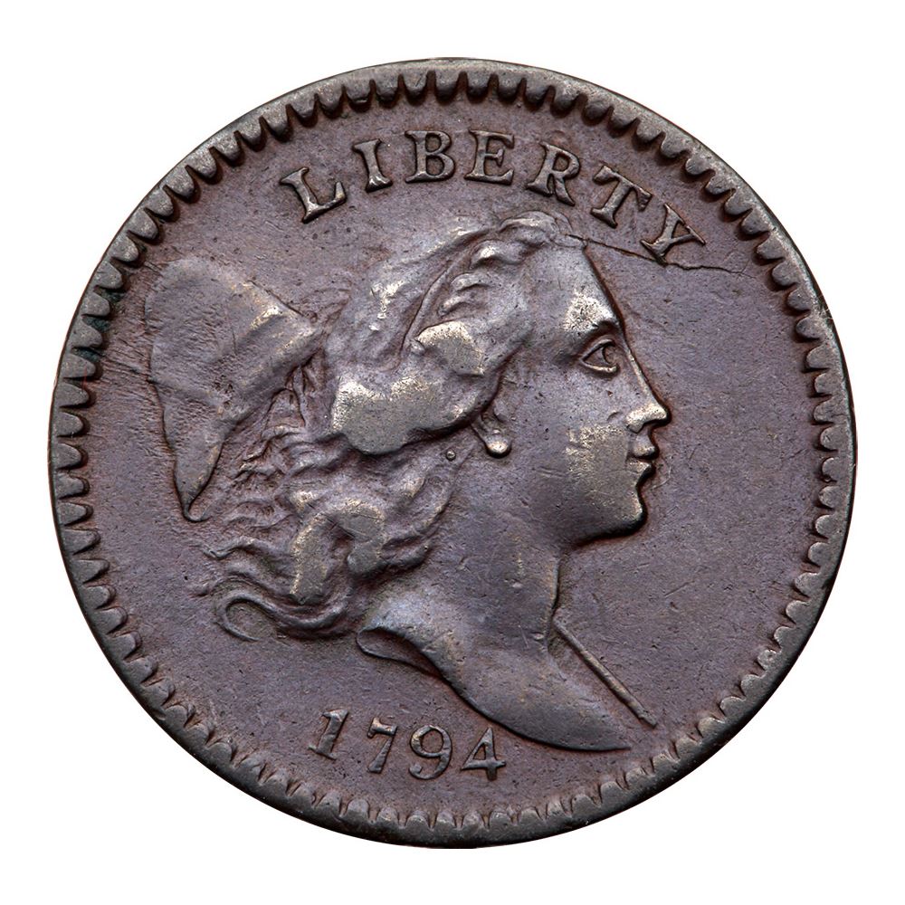 1794 C-9 R2. PCGS graded AU-50. Very attractive glossy medium chocolate brown and steel with frosty lighter reddish steel brown toning in protected areas on both sides. The surfaces are smooth and the only marks are a thin planchet fissure from the forelock through the base of the Y as struck, a small nick or nick-like planchet chip over the A in HALF, a few faint diagonal hairlines at NT in CENT, and a barely visible rim bruise over ER in AMERICA. LDS, Manley state 3.0, with a rim cud involving 4-5 dentils left of the fraction. Our grade is EF40. Comes with an important provenance. The attribution and Widok Collection provenance are noted on the PCGS label. PCGS population 4; 3 finer: 1 in 55, 1 in 60, 1 in 66. PCGS # 35063 Estimated Value 6,000 - UP