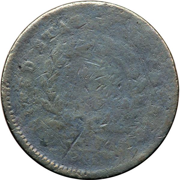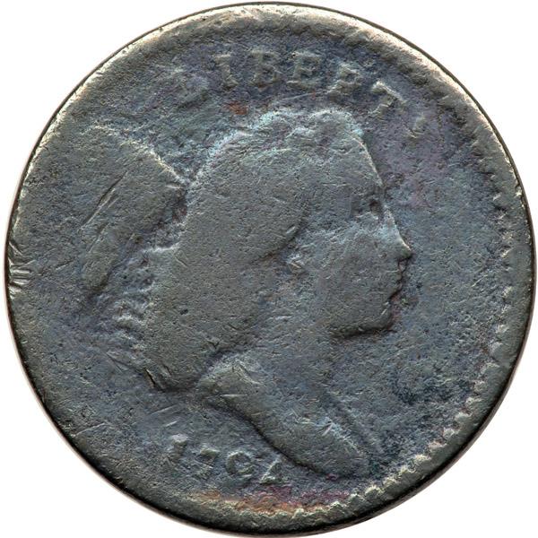 1794 C-9 R8 Liberty Cap, Head Right AG3+. Thin Planchet with Plain (Unlettered) Edge. The obverse is a point or two better while the reverse is weaker. The surfaces are covered with microscopic roughness but are free of any verdigris. Cleaned and retoned olive and dark bluish steel. There is a dull scratch left of the fraction but no other significant marks. The date is clear, about half the reverse legends can still be made out with some effort, and the edge is clean revealing no trace of edge lettering. One of only a very few thin planchet strikes known of this variety, and this is the only one known that is missing the edge lettering. Obviously this planchet failed to pass through the Castaing machine to add the edge lettering during the planchet preparation process. An excessively rare mint error, apparently unique for the variety. Weight 89.7 grains. Davy #94.9.8.