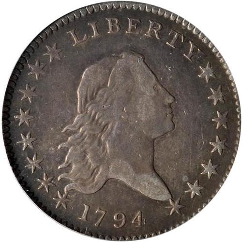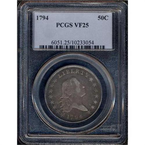 <b>1794 Flowing Hair Half Dollar. PCGS graded Breen-4552. VF25.</b> An impressive 1794 flowing hair half with gorgeous color, smooth surface, and a commanding strike. Far nicer than the usual euphemistic "representative strike for the date," indeed much sharper and better detailed the head and eagle centers. Try to complete a date set of early half dollars, you'll run up against the roadblock of the 1794 issue. The few nice ones were long ago locked away, never to see the light of day. This piece, coming to us from an old time collection, will just as surely be taken off the market the moment it sells. So a strong bid is advised.