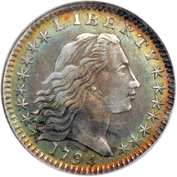 1794 Flowing Hair Half Dime. . LM-2, V2. NGC graded AU-55. Lovely rainbow toning on both sides well struck and lustrous. This is the second rarest variety of the year, and it was struck second in the LM-1 to LM-4 sequence. On the obverse, star 2 points between curls 3 and 4 while the reverse has a double leaf below the final S in STATES, confirming the identity of the variety. A short die crack from a dentil into the field between A and M is about the same as found in later die states of LM-1 which shares this reverse. Pop 5; 58 finer.