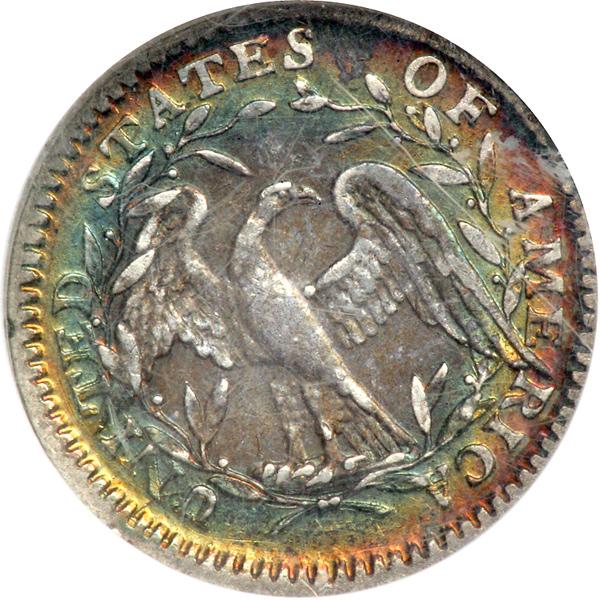 Scot's design features a head of Liberty facing to the right with distinctive flowing hair. Fifteen stars, arranged 8x7, surround the head with the date below and the word LIBERTY above. On the reverse, an eagle stands amid an olive branch with the legend UNITED STATES OF AMERICA around it. There is no indication of this coin's value on either side, nor would there be until the Capped Bust design was adopted in 1829.