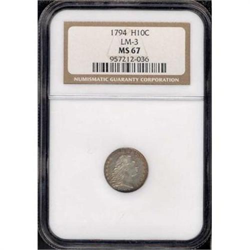 <b>1794 Flowing Hair Half Dime, V-3, LM-3. NGC graded MS67.</b> A thoroughly amazing first year Flowing Hair Half Dime, not only because of its incredible grade, but also by virtue of its superior eye appeal. This splendor coin has it all: free-flowing, unhindered rivers of natural luster, bold crisp sharpness of detail for the Type, and frosty surfaces that are devoid of all but the most trivial of mint-caused planchet flakes. The gently toned old-silver color heightens the appeal of this special coin, heightens it into the stratosphere where only a few can breathe the rarified air. Consider it: a Mint State 67. A coin two hundred and twelve years old (Or perhaps we should call it two hundred and twelve years young, because of its youthful exuberance and top quality beauty.) Boldness is found everywhere, but especially highlighting the peripheral legends and devices at their centers. As might be expected, this is the finest example of the date certified by NGC, regardless of die variety, with none that are finer. Doubtless, this is a status that will remain unique to it for all time. This coin easily surpasses the Eliasberg coin, or any of the other examples of the date that have staked claims to Gem status for that matter.