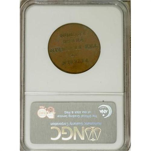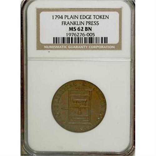 <B>1794 TOKEN Franklin Press Token MS62 Brown NGC.</B></I> Breen-1165. Golden-brown and sea-green toning. This satiny example is crisply struck with only minor softness on the AN in FRANKLIN. A wispy back-and-forth mark is noted on the left obverse field. The die break is halfway across the press. Listed on page 72 of the 2008 <I>Guide Book.<BR>From The Pelican Bay Collection.</B></I><BR><BR><b>Shipping:</b> Coins & Currency (<a target="_blank" href="http://www.heritageauctions.com/common/shipping.php">view shipping information</a>)