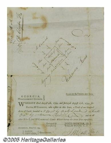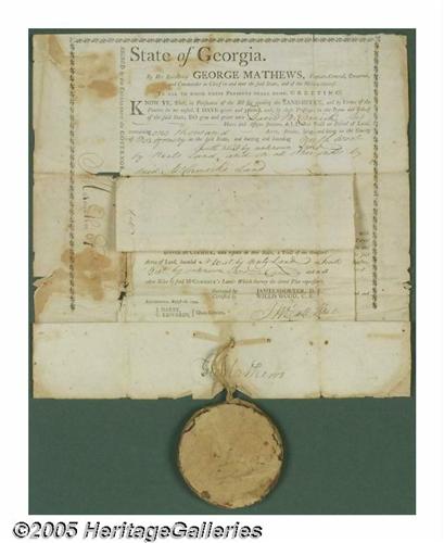 <B>1794 Georgia Land Grant Document</B></I> A partly-printed document, completed in manuscript, dated December 9, 1794, 12" x 12.5". Grants 1,000 acres in Montgomery County to David McCormick, signed by Geo(rge) Mathews, a veteran of the Continental army, as Governor. Montgomery County, the 18th county formed in Georgia, was created December 19, 1793 out of Washington County and was named in honor of General Richard Montgomery, who was in charge of American forces when they captured the Canadian city of Montreal on November 13, 1775. A survey of the land is attached. The document is toned with some foxing and edge roughness, weakness and slight loss at folds. The large paper-on-wax seal of the state of Georgia is amazingly intact and the Mathews signature is bold. Lot:253