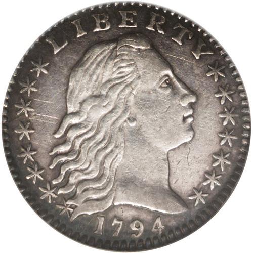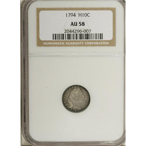 <B>1794 H10C AU58 NGC.</B></I> V-3, LM-3, R.4. All of the 1794 half dimes were actually struck in 1795. Mint records prove this, as the first delivery warrant for half dimes was dated March 30, 1795. Careful study of die use, known as the emission sequence, reveals that the 1794 and 1795 dies were used interchangeably, so it is not possible to determine the exact mintage of either date. This delightful near-Mint example has nearly full luster beneath gunmetal and steel toning, with cobalt-blue and forest-green peripheral accents. Faint abrasions and scratches are consistent with the grade.<BR><BR><b>Shipping:</b> Coins & Currency (<a target="_blank" href="http://www.heritageauctions.com/common/shipping.php">view shipping information</a>)