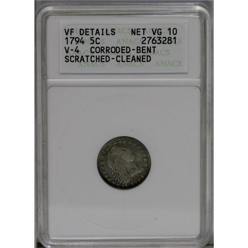 <B>1794<H10C>--Corroded, Bent, Scratched, Cleaned--ANACS. VF Details, Net VG10.</B></I> V-4, LM-4, R.4. A nicely detailed cream-gray example of this desirable early silver type. Four parallel thin obverse pinscratches only moderately distract, and a minor dark spot at 10 o'clock on the reverse constitutes the "corrosion." Wavy above the right (facing) wing, and an indentation affects the eagle's left leg.<BR><I>From The Chief Paduke Collection.</B></I>