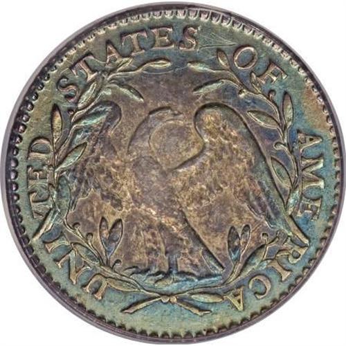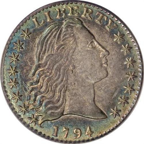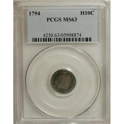 <B>1794 H10C MS63 PCGS.</B></I> V-4, LM-4, R.4. A leaf tip is under the left side of the U in UNITED, and one berry is under the I, promptly diagnosing the LM-4 die pairing. More classically stated, there are three inner berries under the left wing, and no outer berries under that wing. Although designated as R.4, Logan and McCloskey note in <I>Federal Half Dimes 1792-1837 </B></I>that this is the "most common of the four 1794 die marriages." Bold clash marks appear on each side. This piece offers breathtaking, original mint-green, aqua, and pinkish-gray patina. While the surfaces are suggestive of a finer grade, a well-hidden scrape appears between STATES and OF on the reverse, and perhaps the luster that is somewhat subdued by the intense color precludes an MS64.<BR><BR><B>Coin Engraver:</B> Robert Scot<BR><BR><b>Shipping:</b> Coins & Currency (<a target="_blank" href="http://www.heritageauctions.com/common/shipping.php">view shipping information</a>\)