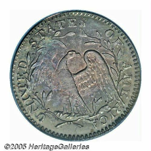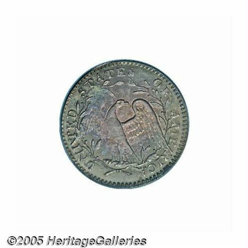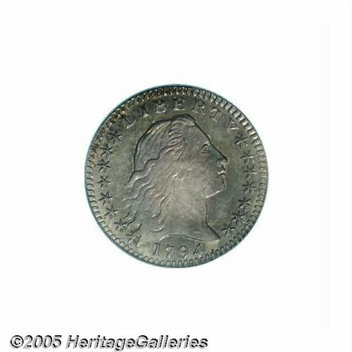 <B>1794<H10C> MS65 PCGS.</B></I> V-1, LM-1, R.6. The V-1, LM-1 is the rarest of the four known die marriages of this first half dime issue. Stars 8 and 12 are boldly recut, as is the upright of the T in UNITED, but the most easily discernible diagnostic are the two berries under the eagle's left (facing) wing. Robert Scot's Flowing Hair half dime is similar in overall design to his half and silver dollar from the same year. Actually struck in early 1795, the 1794 half dime is approximately ten times scarcer than the 1795 half dimes which were also struck in the same calendar year. Of course, many of the known high grade Mint State 1794 and 1795 half dimes are from the Wadsworth-Rea hoard, but these pieces are generally of lesser quality than this exceptional coin. Rich olive, gray, and rose colored toning is seen over each side with strong underlying mint luster. There are no abrasions apparent on either side of this immaculate coin. The only technical flaw we see is irregular striking definition on the devices. Undoubtedly the finest V-1 known.<BR><I>From The Melrose Bay Collection.</B></I>