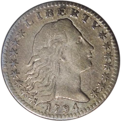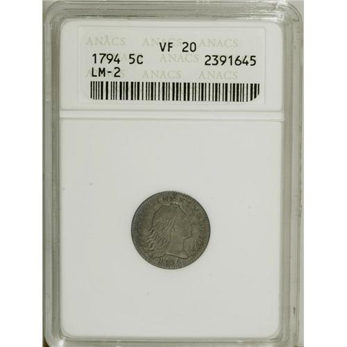 <B>1794 H10C VF20 ANACS.</B></I> V-2, LM-2, R.5. Apple-green and ocean-blue patina embrace this attractively detailed first-year Flowing Hair half dime. The surfaces are relatively free from marks, and are problem-free for the grade. LM-2 is the second scarcest of the four die marriages of the date.<BR><BR><b>Shipping:</b> Coin/Currency (<a target="_blank" href="http://www.heritageauctions.com/common/shipping.php">view shipping information</a>)