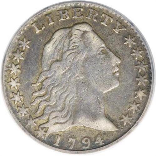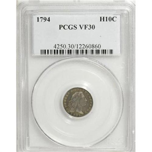 <B>1794 H10C VF30 PCGS.</B></I> V-1, LM-1, R.6. The 179 is distant from the 4. Star 1 points to the gap between the first two hair curls. This is the first and rarest die pairing for the year of the new half dime denomination, first produced in 1794. The surfaces of this attractive piece are steel-gray with silver highpoints, and the coin is overall quite appealing. There are a few light, undistracting adjustment marks in the obverse center, but the only mentionable poststrike abrasion is a nick below the eagle's left (facing) leg. A nice example of this most elusive die marriage.<BR><BR><B>Coin Engraver:</B> Robert Scot<BR><BR><b>Shipping:</b> Coins & Currency (<a target="_blank" href="http://www.heritageauctions.com/common/shipping.php">view shipping information</a>)