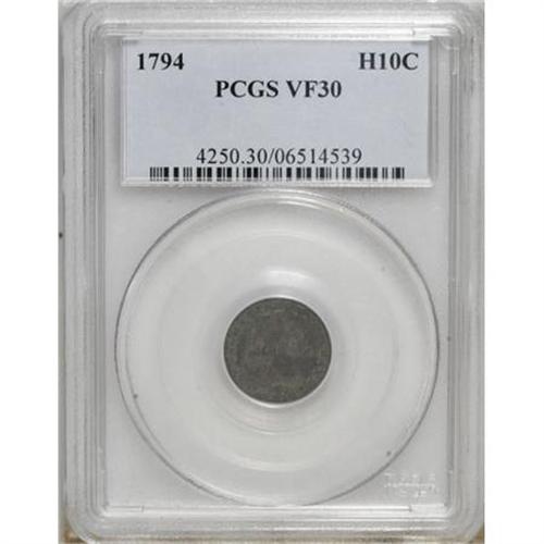 <B>1794 H10C VF30 PCGS.</B></I> V-4, LM-4, R.4. Deep forest-green and dove-gray toning blankets this midgrade example. Evenly struck, and smooth aside from a pinscratch beneath the chin. The Flowing Hair type was issued only in 1795, with the 1794-dated dimes included in a March 1795 delivery.<BR><BR><B>Coin Engraver:</B> Robert Scot<BR><BR><b>Shipping:</b> Coins & Currency (<a target="_blank" href="http://www.heritageauctions.com/common/shipping.php">view shipping information</a>)