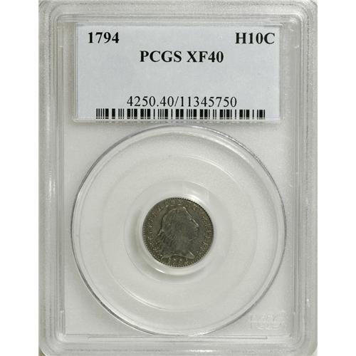 <B>1794 H10C XF40 PCGS.</B></I> V-2, LM-2, R.5. On the obverse, digit 1 of the date is under the right center of curl 1 equidistant between the curl and dentils, star 1 is joined to curl 1 and curl 2, and the base of digit 4 almost touches the dentil; on the reverse, a leaf pair is below the second S in STATES, a leaf point ends beneath the center of the U in UNITED, and there are 6 berries on the left branch and 6 on the right. Silver-gray surfaces on this XF example display sharply defined design elements, including good detail in Liberty's hair, the eagle's tail, and on most of the wing feathers. The dentilation is virtually complete and relatively strong. Generally clean surfaces reveal a few minute obverse contact marks. A scarce die marriage, and nice overall for the grade.<BR><BR><b>Shipping:</b> Coins & Currency (<a target="_blank" href="http://www.heritageauctions.com/common/shipping.php">view shipping information</a>)