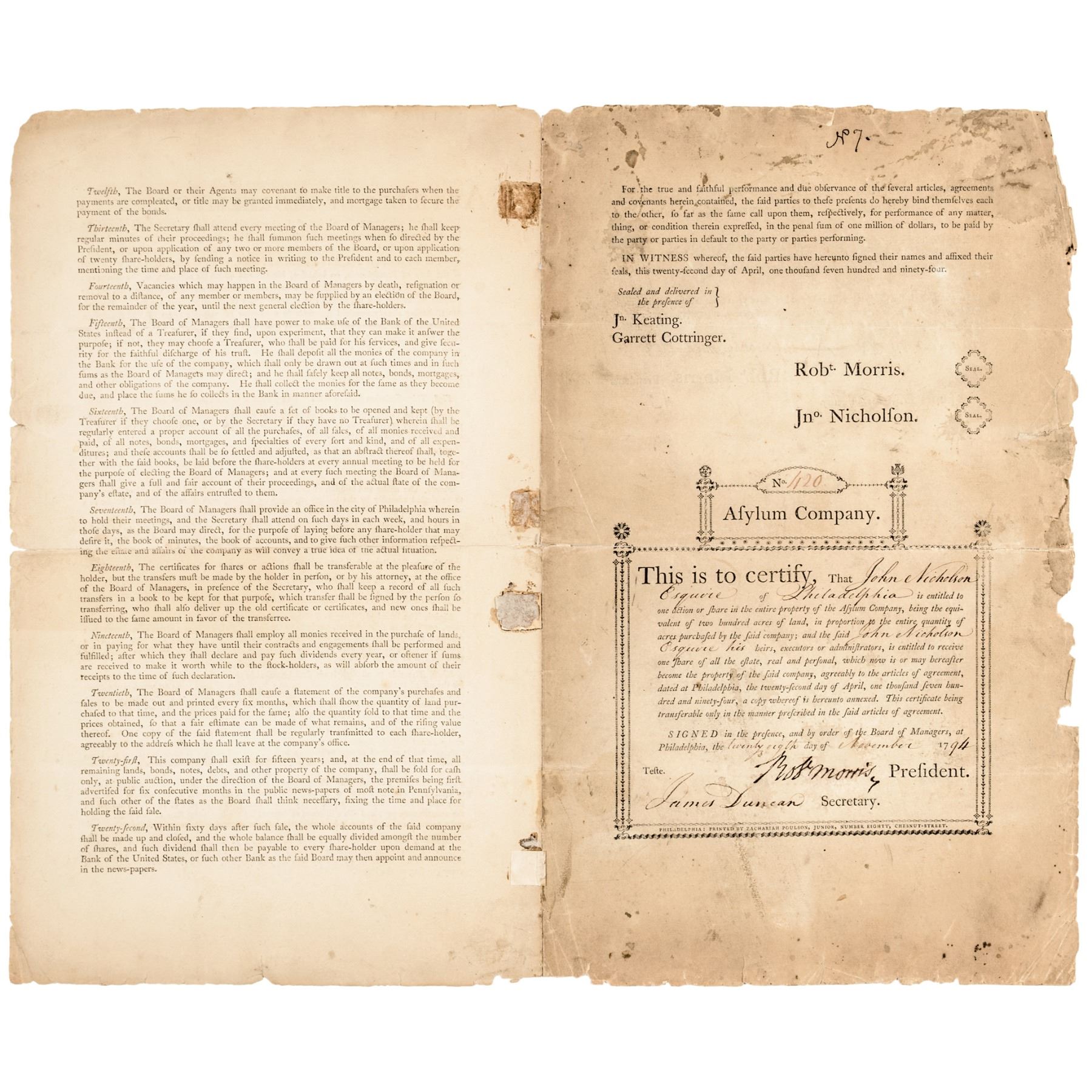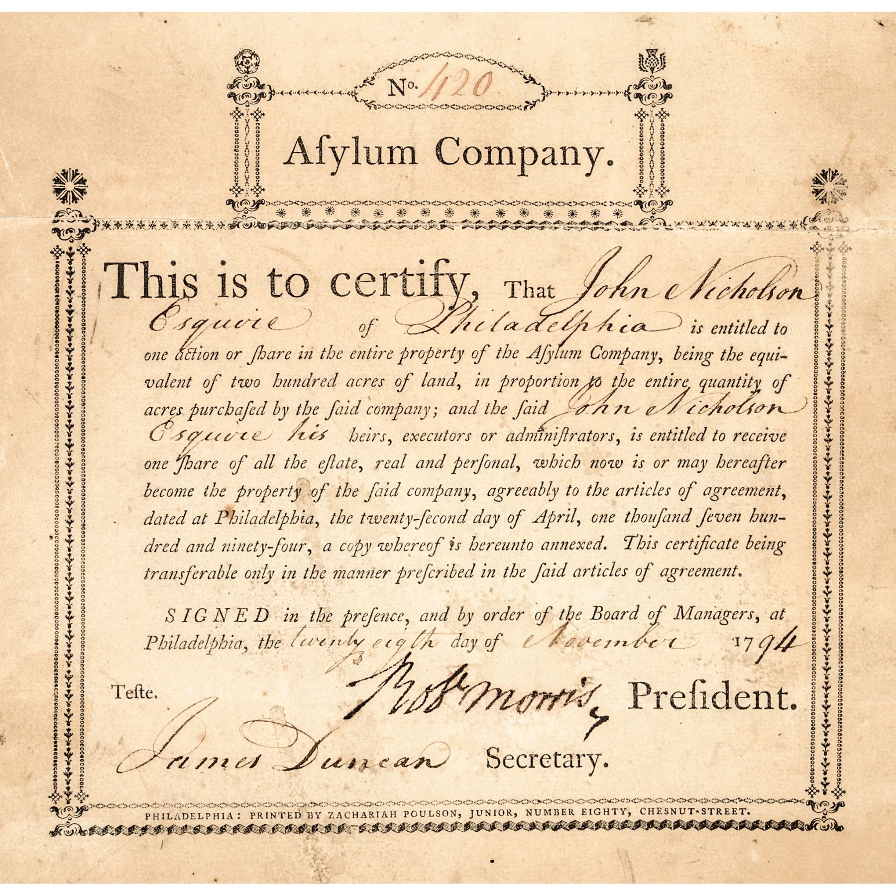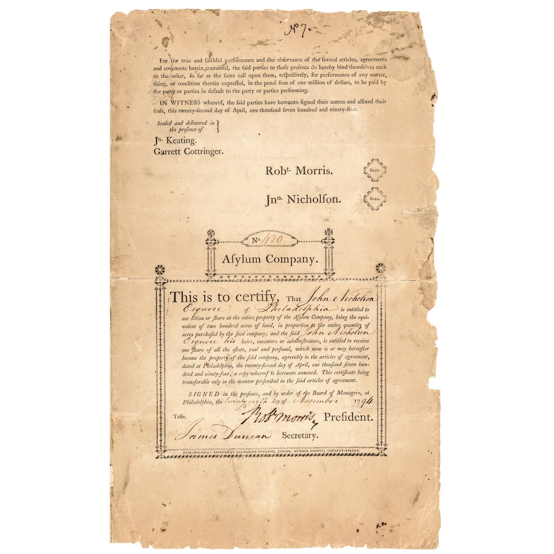 November 28th, 1794-Dated, Partially-Printed Document Signed, “Robert Morris” as President, Asylum Company, Issued Stock Certificate, Number 420, One Share, Philadelphia, Fine. This large size Certificate Folio, measuring 16” x 10”, bifolium, typeset printed by letterpress on heavy laid period paper, completed and signed by hand. Certifying that John Nicholson Esquire of Philadelphia (1757-1800) (financier, land speculator, and Comptroller General of Pennsylvania from 1782 to 1794 and manager of the Asylum Company) is entitled to One Share of the Asylum Company equivalent of two hundred acres of land. Boldly Signed by Robert Morris as President of the Company, and James Duncan, as Secretary in deep rich brown ink. This Document archivally conserved to reinforce along the horizontal folds, front sheet evenly toned with some scattered soiling, outer edges chipped, and the paper is somewhat delicate. Very rare and historically important, being of special interest due to its being noted as (Number) “No 7” that is handwritten at top of the front page, and being made to none other than Morris’s business venture partner, John Nicholson.