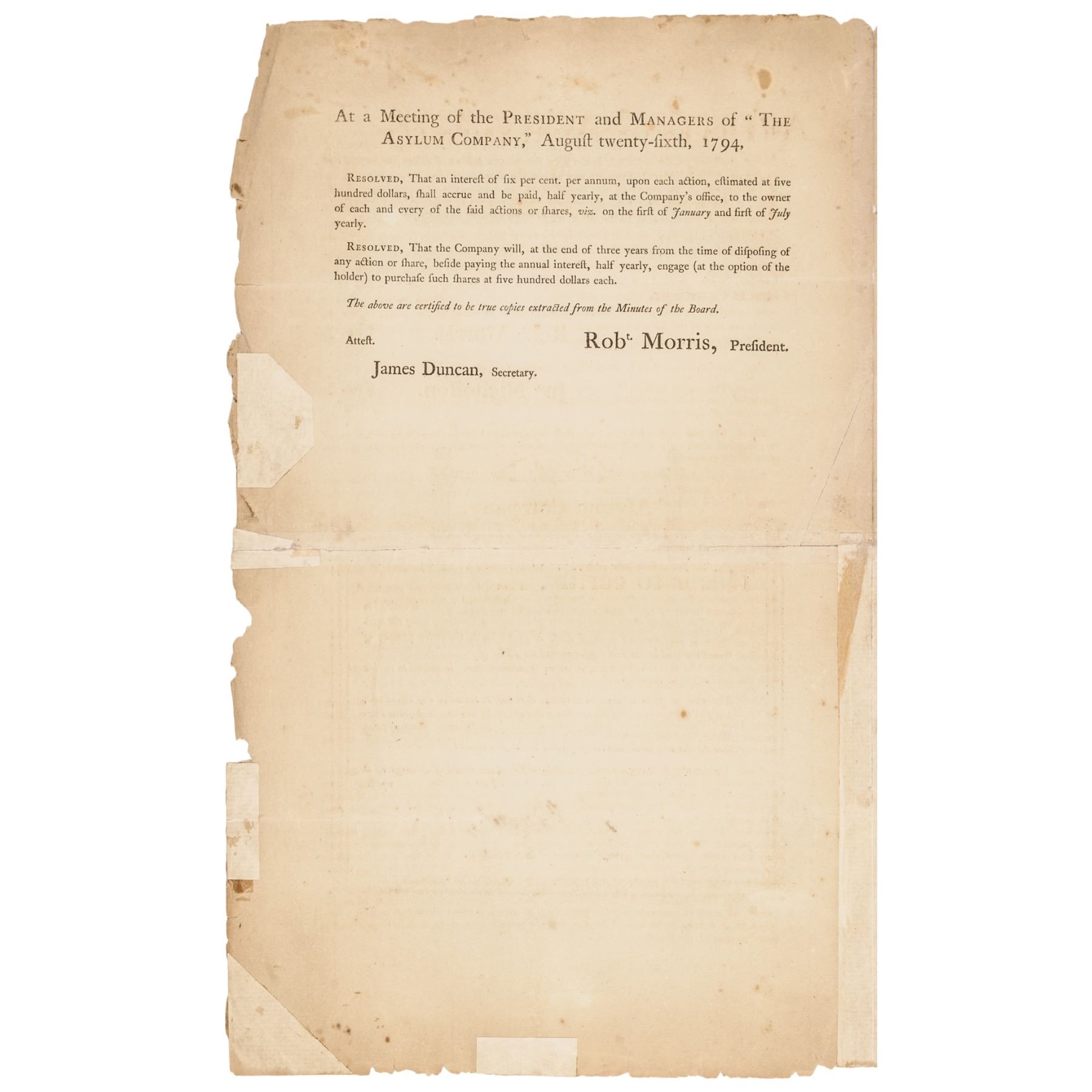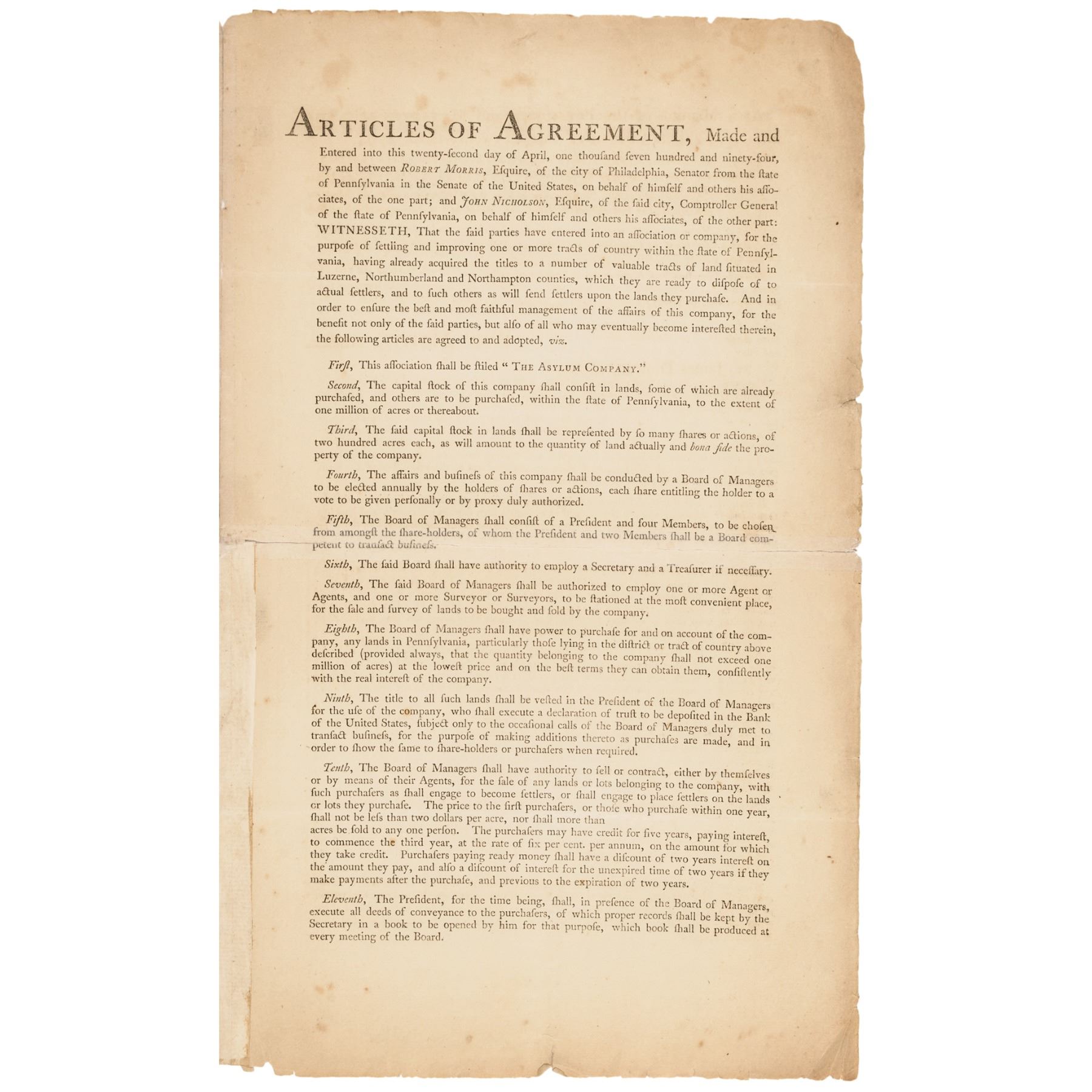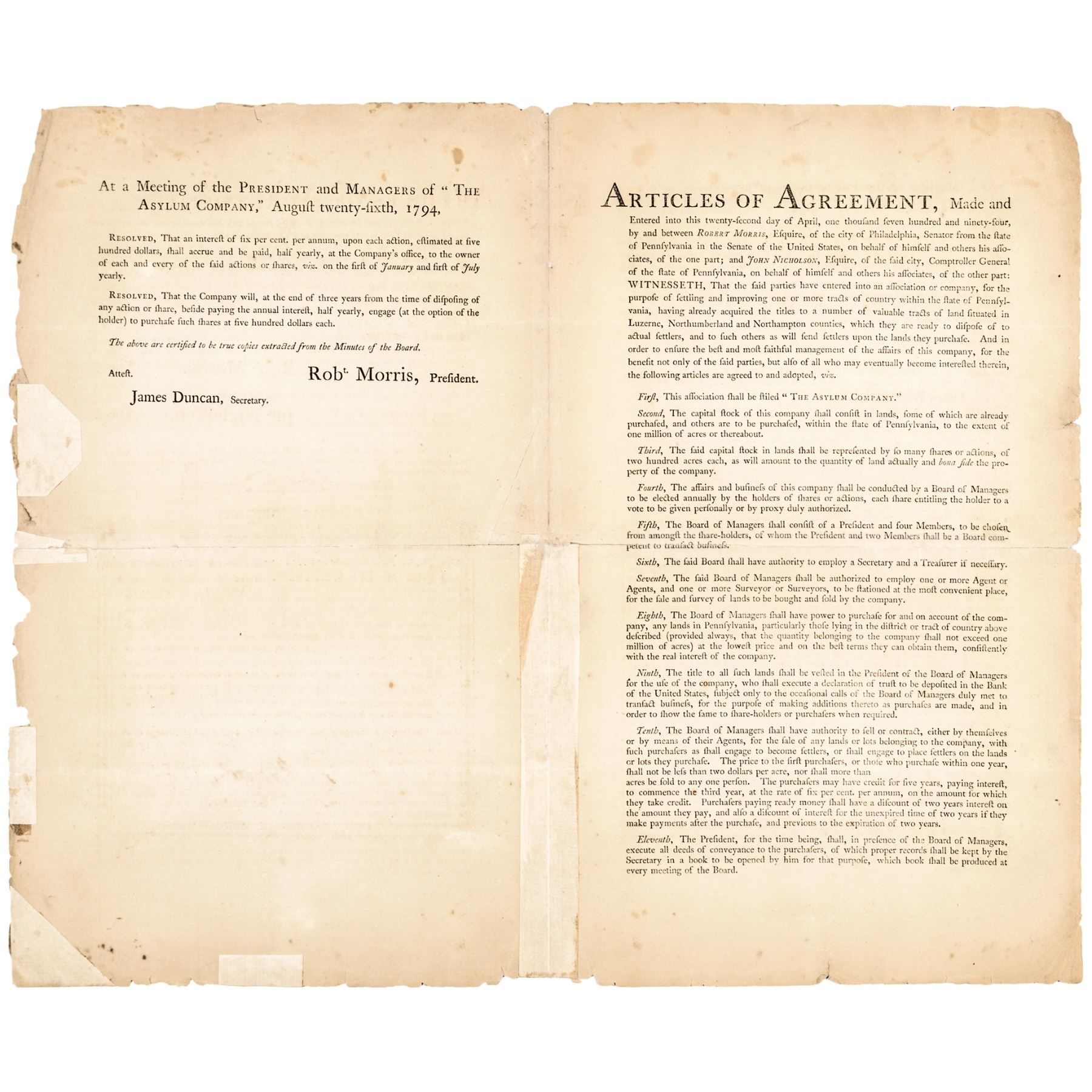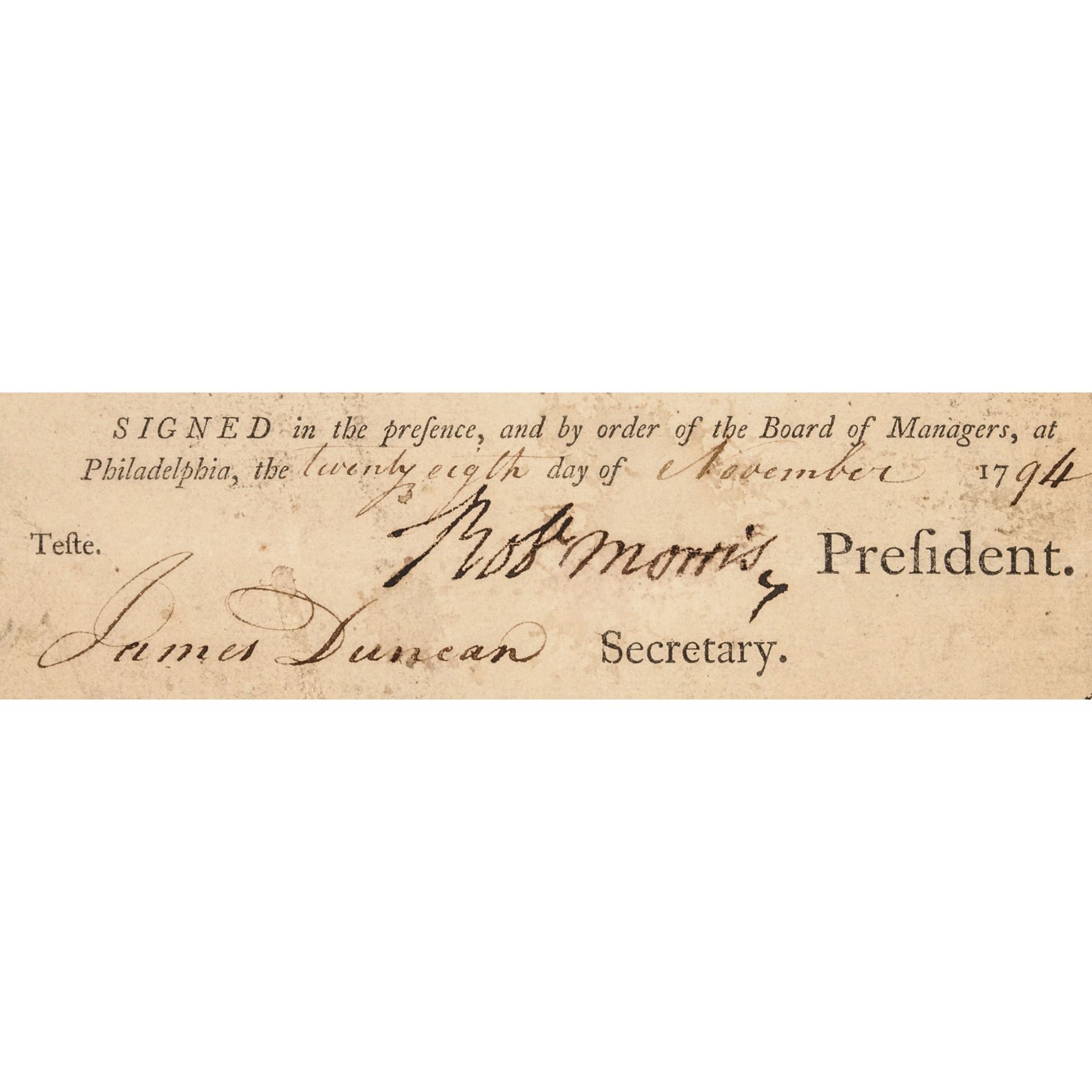 November 28th, 1794-Dated, Partially-Printed Document Signed, “Robert Morris” as President, Asylum Company, Issued Stock Certificate, Number 420, One Share, Philadelphia, Fine. This large size Certificate Folio, measuring 16” x 10”, bifolium, typeset printed by letterpress on heavy laid period paper, completed and signed by hand. Certifying that John Nicholson Esquire of Philadelphia (1757-1800) (financier, land speculator, and Comptroller General of Pennsylvania from 1782 to 1794 and manager of the Asylum Company) is entitled to One Share of the Asylum Company equivalent of two hundred acres of land. Boldly Signed by Robert Morris as President of the Company, and James Duncan, as Secretary in deep rich brown ink. This Document archivally conserved to reinforce along the horizontal folds, front sheet evenly toned with some scattered soiling, outer edges chipped, and the paper is somewhat delicate. Very rare and historically important, being of special interest due to its being noted as (Number) “No 7” that is handwritten at top of the front page, and being made to none other than Morris’s business venture partner, John Nicholson.