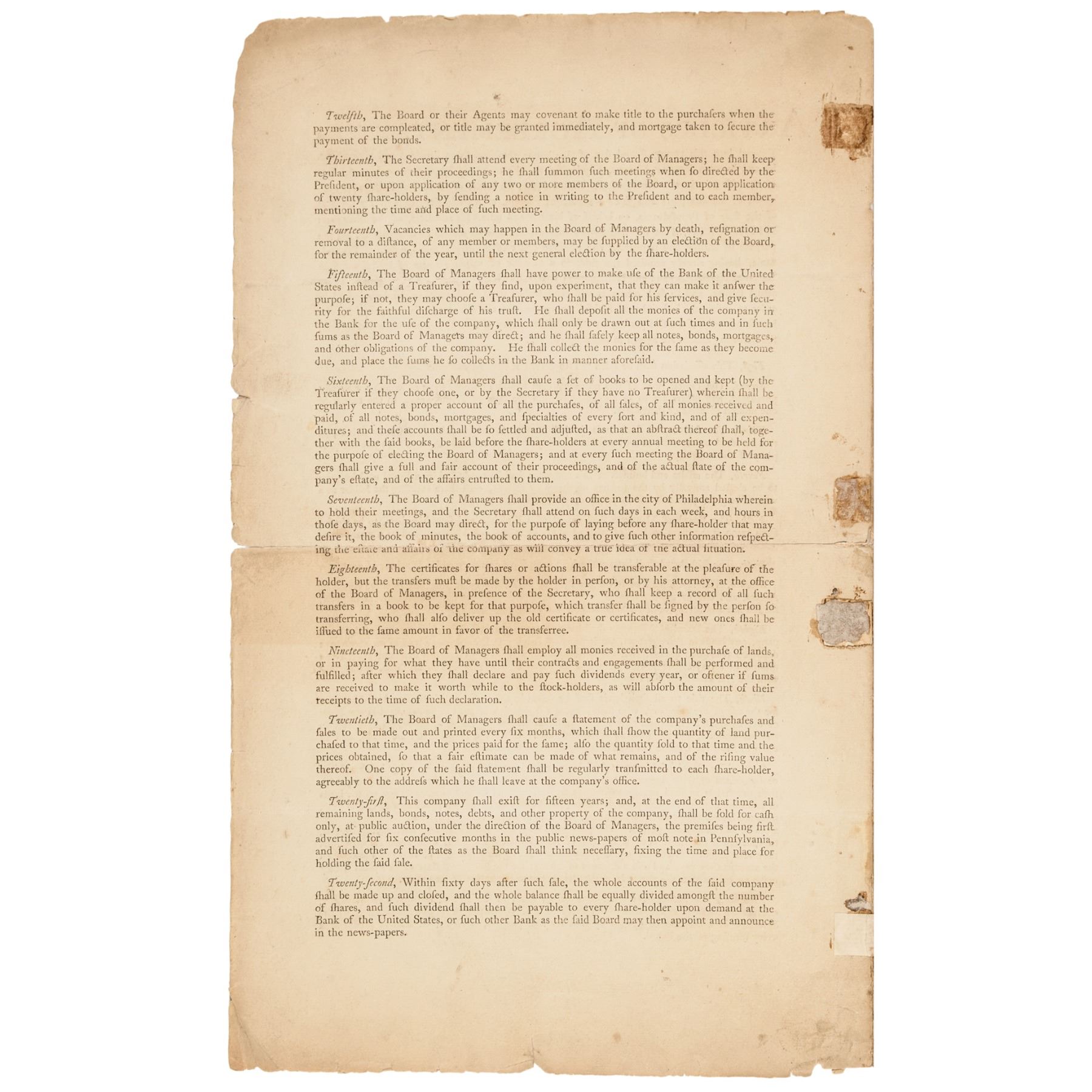 This rare form Certifying that, “John Nicholson Esquire of Philadelphia (1757-1800) (financier, land speculator, and Comptroller General of Pennsylvania from 1782 to 1794 and manager of the Asylum Company) is entitled to One Share of the Asylum Company equivalent of two hundred acres of land.” Boldly Signed by Robert Morris as President of the Company, and James Duncan, as Secretary both being in deep rich brown ink. This Document has early paper conservation strips to reinforce along the horizontal folds reinforcing the paper and hinging. The facing sheet is even in moderate tone with some scattered soiling, its outer edges chipped. The heavy laid period paper is somewhat delicate yet displays Morris’s 2.25” long signature very boldly. This is a well known, highly collected rare and historically important item to Stock and Bond collectors. It may be of special interest due to its being noted as (Number 7) “No 7” handwritten at the top edge of the front page and being made to the name of Morris’s business venture partner, John Nicholson.