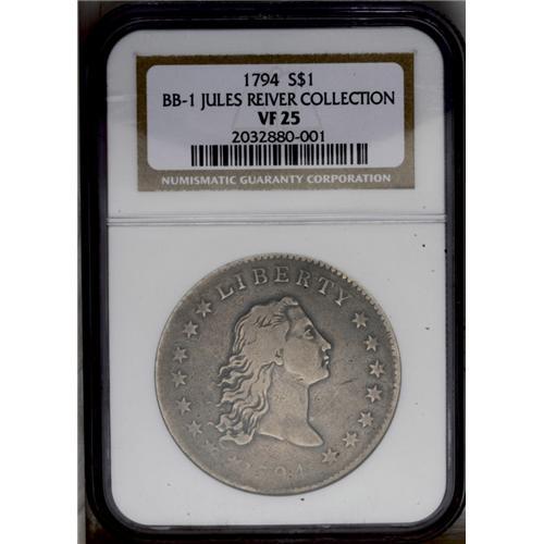 <B>1794<img border='0' src='http://www.heritagecoins.com/images/star.gif' width=10 height=10>$1> B-1, BB-1, R.4. VF25 NGC.</B></I> Ex: Jules Reiver Collection. Lowest curl near star 2; leaf joins second T of STATES. This is the Reiver plate coin for the obverse and reverse of this variety. Described in the Superior catalog as "An unusually attractive coin for the grade with lovely even gray color on both the obverse and reverse. The strike is above average with approximately half of the date present and the stars at the left fairly well detailed. On the reverse, much of the word STATES is indistinct. This weakness is further accentuated by the presence of some fairly heavy adjustment marks which ring much of the border. The obverse fields are very clean with no significant marks noted; two identifying reverse rim marks located at 2 o'clock and 3 o'clock, readily serve as identification. This is as attractive an example of a middle grade 1794 Dollar as we can imagine and it is especially worthy of praise for its originality and excellent appearance."<BR> Of the original mintage of 1,758 pieces, there are approximately 130 coins known. Many show adjustment marks, usually found along the reverse rim. Most of the issue was poorly struck, notably on the left side of the obverse and reverse, as seen on the current specimen. Of the known examples, the majority are weak among the stars on the left of the obverse, and similarly weak on the upper portions of the letters in UNITED STATES. A few sharper impressions are known. Breen noted that in 1794 the Philadelphia Mint did not have a coining press large enough to coin silver dollars, and thus the smaller press used for half dollars and small coins was used. The design featured Liberty looking upward with her hair curls flowing freely in the breeze. Fifteen stars surround Liberty, one for each state in the union at that time, with the date below and LIBERTY above. On the reverse a delicate eagle is perched on the ground, with its wings outstretched, surrounded by a laurel wreath with UNITED STATES OF AMERICA near the rim. On the edge of the coin the value was noted as HUNDRED CENTS ONE DOLLAR OR UNIT with decorations between the words. This particular coin was used to make at least one counterfeit example of this very scarce coin. Apparently a high quality transfer die was created from this master coin, then a new coin was created by melting silver and trace metals together and pouring the liquid metal into the mold. Jules had the unfortunate luck of buying the counterfeit 1794 dollar from a dealer, Max Kaplan, in November 1967. No indication of the fraud was seen, and Jules never suspected his coin was a counterfeit. Some years later Jack Collins was working on a detailed census of all known 1794 silver dollars, and contacted Jules for a photograph of his coin. Jules provided an excellent photograph and sent it to Collins. Collins returned a note to Jules and thanked him for his input and noted that Jules had the Robison coin from that famous 1982 sale by Stack's. Jules figured Jack was wrong, since he had owned his coin since 1967. Regrettably, the Collins manuscript on 1794 was not published. Fast forward to 1988, when Jules's friend and fellow Bust dollar collector Woody Blevins passed away. Jules worked with Superior Galleries and helped catalog the Blevins collection of Bust dollars; lo and behold, there was a close match to his own 1794 silver dollar in the Blevins collection. In fact, it was an exact match. Jules bought the Blevins coin at the auction and compared it with his coin. Every single adjustment mark, nick, and scratch matched perfectly. Clearly, one was the copy of the other. After close examination, it was noted that the Kaplan 1794 dollar had a small area on the rim without any edge ornamentation or lettering and was almost certainly the "gate" or opening in the mold to allow the molten silver to be poured into the cast. Further examination noted that the adjustment marks and other nicks were slightly more shallow on the Kaplan coin, and thus it was determined that most likely the Kaplan coin was a copy of the Blevins/Robison coin. When the two pieces were shown to Eric Newman and Walter Breen at the 1990 ANA show, both were amazed at the quality of the suspected counterfeit. Extensive metallurgical tests on the counterfeit coin showed it to contain the proper amount of silver, but the trace elements were not carefully monitored, as the counterfeit contained too much gold and not enough copper. The counterfeit example will likely be donated to the ANA Museum. The counterfeit might never have been detected were it not for the sheer coincidence that the master and copy showed up and were recognized by Jules, and through the research of Jack Collins on his 1794 silver dollar census. Counterfeits made from transfer dies show slightly less detail than the original master coin, but given the amount of circulation and overall quality of the counterfeit, they can be extremely difficult to detect. In point of fact, one could imagine both an original and counterfeit example appearing over a span of decades in various auctions, with no one realizing that two coins were thought to be a single example in the census.<BR> Obtaining a 1794 silver dollar is certainly one of the highlights of any advanced collection, and this coin is a highly desirable example for the grade. Few coins can boast as much allure and romance as our nation's first silver dollar, the basic "unit" of monetary coinage. Given the paltry number struck and extremely high demand for any specimen of this issue, we anticipate this attractive coin to find many suitors.<BR><I>Ex: James Kelly (February, 1964), lot 1028; Stack's Robison Sale (February, 1982) lot 1852; A & B Coins-Bob Cathcart; Superior's H. W. Blevins Sale (June, 1988), lot 3574.</B></I> Envelope Included.