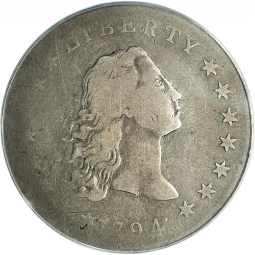 <B>1794<img border='0' src='http://www.heritagecoins.com/images/star.gif' width=10 height=10>$1> VG10 PCGS.</B></I> B-1, BB-1, R.4. We last offered this identical silver dollar in our 1996 ANA Signature Sale as lot 5511. At the time, we commented: "As the first year of issue for silver dollars, the 1794 was destined to be a favorite of collectors. But it is also one of the rarest dollars ever struck with only 1,758 pieces produced. Today 90-100 pieces [now 125 to 130] are estimated to still be extant in all grades and almost all these coins have known pedigrees thanks to the tireless efforts of Jack Collins over the past twenty years. While lacking almost all the detail on the left side of the obverse (weakness in this area is characteristic of almost all '94 dollars), this is actually quite a nice example for the collector who cannot pay the astronomical prices asked for high grade examples. The surfaces are exceptionally smooth overall. The most obvious marks that can be used for pedigree purposes are a pair of near-vertical marks on the lower cheek of Liberty, a check-shaped die flaw outside star 1, and a long, thin scratch that extends from the rim through the 4 in the date and bends above the first star into the rim again. On the reverse much of UNITED STATES is gone also, but there are no mentionable abrasions on that side. Both sides display a light gray patina overall with a faint undertone of rose."<BR> More recently, Martin Logies provided further details in his 2004 study of the same subject: "Die State III with clash marks visible on obverse and reverse, and third hair curl shallow. Strike weakness is visible at the bases of the numerals of the date, obverse stars one through eight, the ends of Liberty's hair curls, the tops of the letters LIBE, and the tops of the letters in UNITED STATES on the reverse. The obverse displays a number of handling marks, the most notable being a long, thin scratch from the area between stars one and two, running to the right above star one and the numerals 179 in the date, and then cutting through the numeral <BR><BR><B>Important notice:</B> Heritage usually auctions material at the rate of 200-250 lots per hour. On some occasions eBay Live bid software or the Internet may not be able to keep up with the pace of the auction. We recommend placing a realistic absentee bid now as insurance to avoid disappointment. Occasionally the auctioneer may eliminate or reject an eBay Live bid, and the auctioneer may also reopen a lot after the close of the eBay live bidding (usually because we missed an audience bid), and may reject your bid even if it shows you as the winning bidder. By bidding via eBay Live, you agree that Heritage may award the lot to another bidder at its sole discretion under the circumstances described above or any other reasonable circumstances. Since eBay bids are not shown to us until we open the lot on the floor, we treat those bids just like floor bids. In most cases the floor responds before the eBay bid is presented to us, due to Internet lag time, so for consistency we have made it a policy that floor bids are always considered first over tie eBay live bids. Also please note that all Heritage lots purchased through eBay Live carry a 20% Buyer's Premium. Please make sure you read the Terms and Conditions before you bid. This lot is being auctioned in conjunction with a live floor auction by Heritage Galleries & Auctioneers. All final auction and invoice information will be supplied by Heritage Galleries & Auctioneers, and all other information should be considered preliminary. Lot:2099 <BR><BR><B>Winning Notification and Billing:</B> After the FINAL session in this auction is complete, Heritage will send e-mail and snail mail invoices. This process normally takes several days. All final auction and invoice information will be supplied by Heritage Galleries & Auctioneers, and all other information should be considered preliminary. <BR><BR>This auction will be conducted on a live auction floor and over the Internet through eBay Live. If you choose to place an absentee bid, please take a moment to <font color='#0000ff'><u><a href='http://pages.ebay.com/liveauctions/help/before/laabsentee.html'>learn how eBay Live absentee bidding works</a></u></font><font color='#000000'>