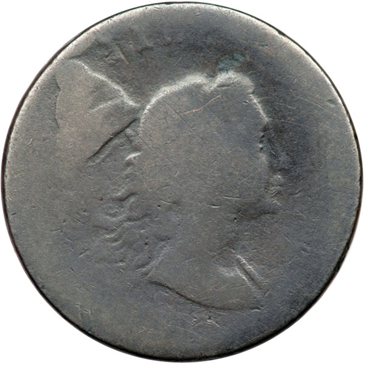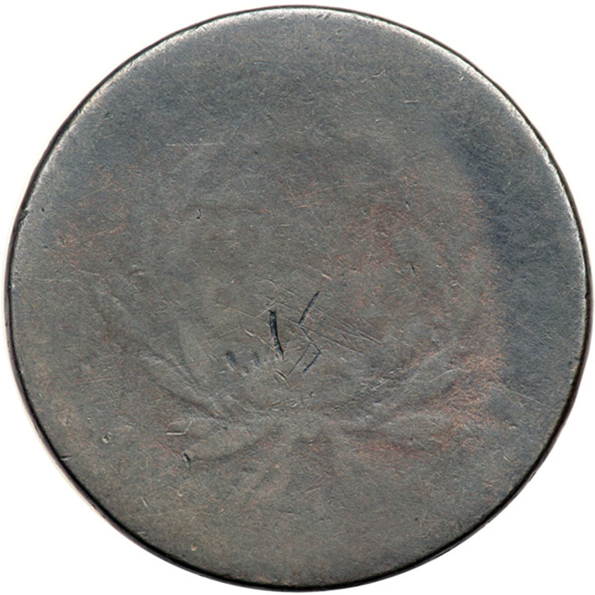 1794 S-19a R5+ Fair-2. Head of 1793 with the Edge Device of 1793 (leaf points down). Blundered edge reading "ONE HUNDRED D FOR A DOLLAR." Smooth glossy chocolate brown. No defects, just lots of honest wear. The date is very weak. Only the tops of the 794 remain visible, and they are faint. The portrait (Head of 1793) is nearly complete and about a third of the reverse designs can be made out. The blundered edge device is complete and clear.