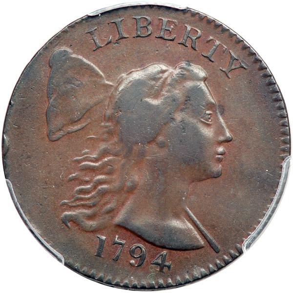 1794 S-20 R5 Head of 1793 with Straight Date. PCGS graded AU-50. Glossy chocolate and steel brown with darker steel brown toning on the highpoints and frosty lighter brown toning covering the protected areas on both sides. There is a tiny spot of darker reddish olive brown toning on the nose before the eye plus larger but more subtle splashes of similar reddish chocolate brown toning at TED, STA, OF, and in the dentils at RI in AMERICA. The surfaces are smooth and very attractive, virtually void of contact marks. The only notable sign of contact is a tiny rim bruise left of the bottom of the cap. Late die state, Breen state II, with a faint wave in the field from the chin to the rim at right. This is an outstanding example of a rare and very popular die variety, and it is arguably the finest example known outside the American Numismatic Society (ANS) collection. Bill Noyes calls this piece VF30 (Noyes photo #22590) and has it tied for CC#2 honors with one other piece behind the ANS example. Bland says VF25 and tied for CC#4 in his census, but a comparison of photos clearly supports the Noyes arrangement. Our grade is VF30. This cent was called EF45 by PCGS in an earlier assessment, but upon further review they have justifiably raised their grade to the currently assigned AU50. Noyes plated this example in his 2006 book on the series and Samuel Hudson Chapman used this piece to illustrate the obverse die in his 1923 monograph "The United States Cents of the Year 1794." And this cent comes with a long, very impressive provenance that includes many of the "heavyweights" of 1794 cent collectors. PCGS population 1 with none finer for the variety.