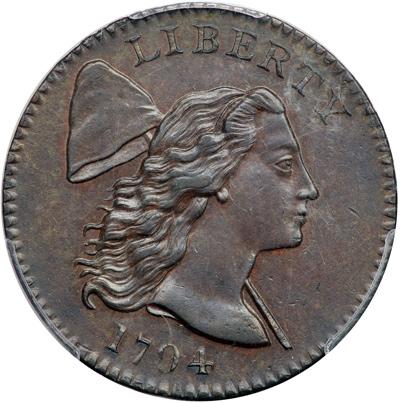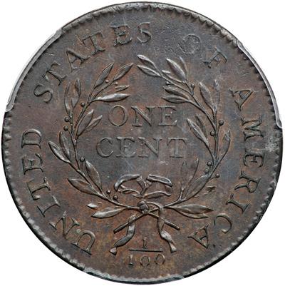 1794 S-22 R1. PCGS graded MS-63 Brown. Lustrous dark steel brown and chocolate with underlying frosty lighter brown faded down from mint color showing through in protected areas. No defects other than a few of the usual microscopic planchet flakes scattered about both sides, strongest at the O in OF but even those are not visible to the unaided eye. Great eye appeal, just a touch of rub on the highest points from mint state. Scarce EDS, Breen state I, before the usually seen "mounds" formed on the reverse as a result of die sinking during use. Called AU55 and tied for CC#1 honors in the Breen/Bland census. Noyes says AU55 and tied for CC#1 as well, his photo #20379. Our grade is AU55. PCGS Population 1; The Finest graded at PCGS for the variety. DWH #3471.