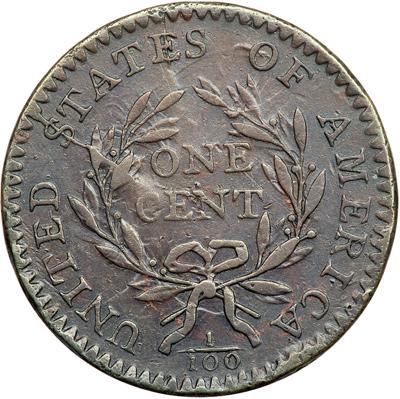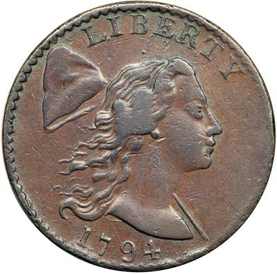 1794 S-26 R2. VF-20 Plus. Sharpness near VF30 but there are several light rim bruises, including one under the 17 and another slightly stronger one at the second A in AMERICA. There are a few faint hairline scratches on the obverse as well, but these are visible only with the aid of a glass. The obverse is glossy medium brown with steel brown toning on the highpoints and frosty lighter brown toning in protected areas. The reverse is glossy chocolate brown. LDS, Breen state VII. The reverse die cracks are strong and swelling is weakening CE in CENT, although both letters are still clearly visible. DWH #3035.