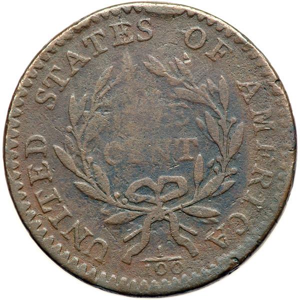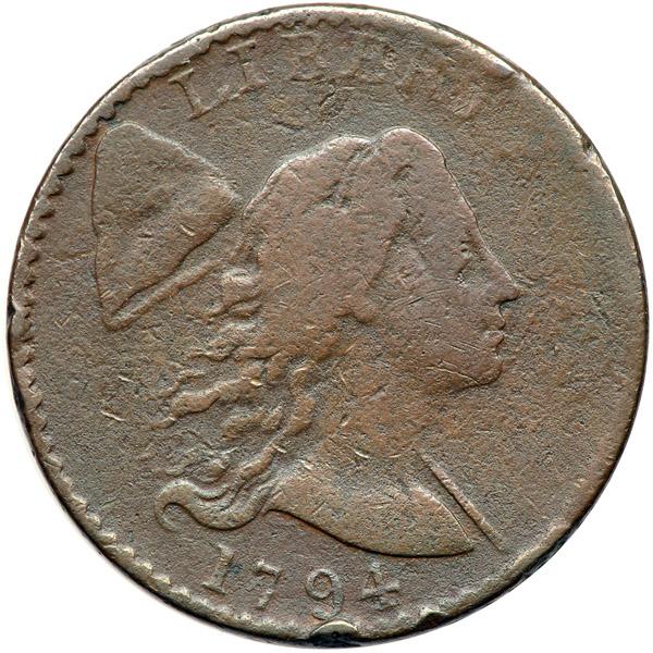 1794 S-26 R2 VG8. Slightly sharper but covered with uniform very fine granularity. No verdigris and only a few contact marks, including a pair of rim nicks under the 94 and a light rim bruise at the top of the reverse. Slightly glossy chocolate and steel brown. The date is strong and the legends are complete except for weakness inside the wreath due to the usual swelling in that area. MDS, Breen state III, with a strong die crack down through the E in STATES to the E in CENT.