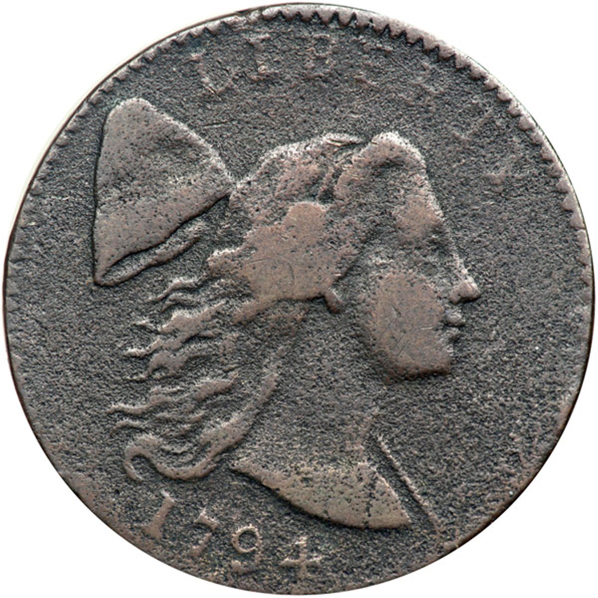 1794 S-28 R2 VG7. Sharpness F12 but the planchet is covered with uniform very fine granularity on all but the highpoints, which are smooth. No verdigris and the only mark is a tiny planchet chip on the rim over the I in LIBERTY. Slightly glossy chocolate and dark steel brown. The date is clear and the legends are complete.