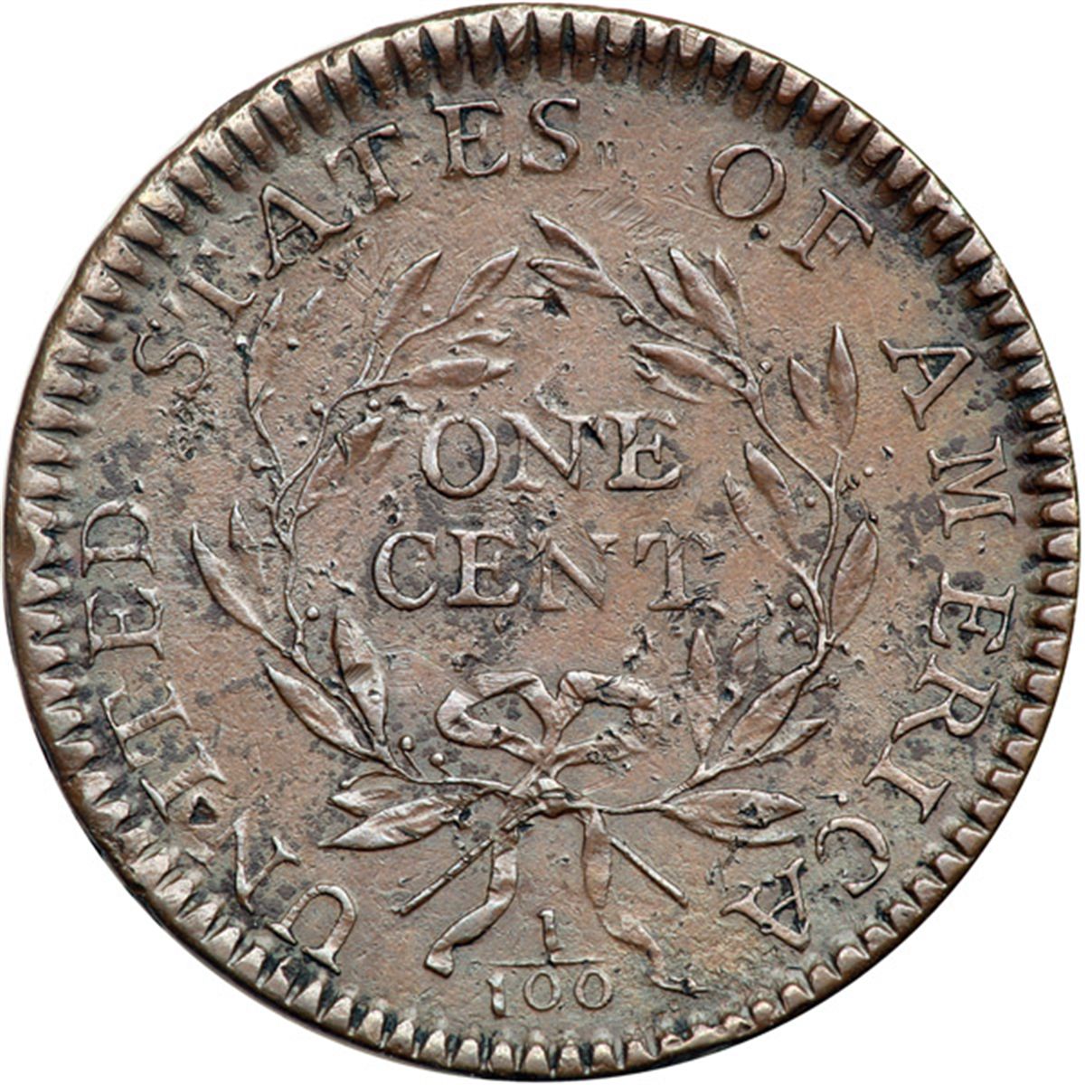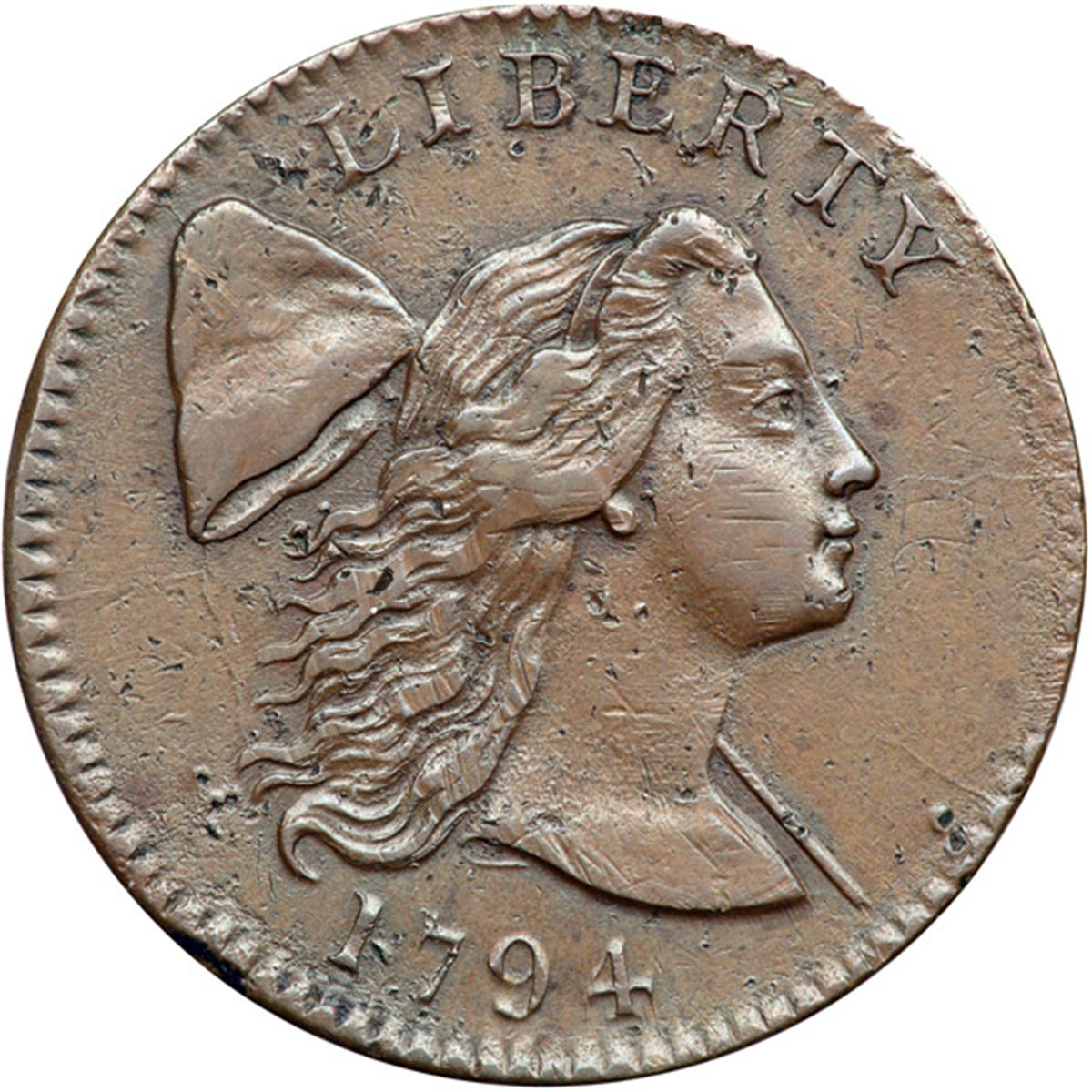 1794 S-29 R2 VF20. Sharpness EF40 but there are dozen of very tiny pinpricks scattered over both sides, none notable but far too many to ignore. A light rim bruise left of the date and a dull rim nick at the D in UNITED are the only notable marks. Glossy medium brown and light chocolate with some small splashes of reddish chocolate toning on the reverse. Nicely struck MDS, Breen state III, with a fine die crack from the dentils to the R in AMERICA but not beyond.