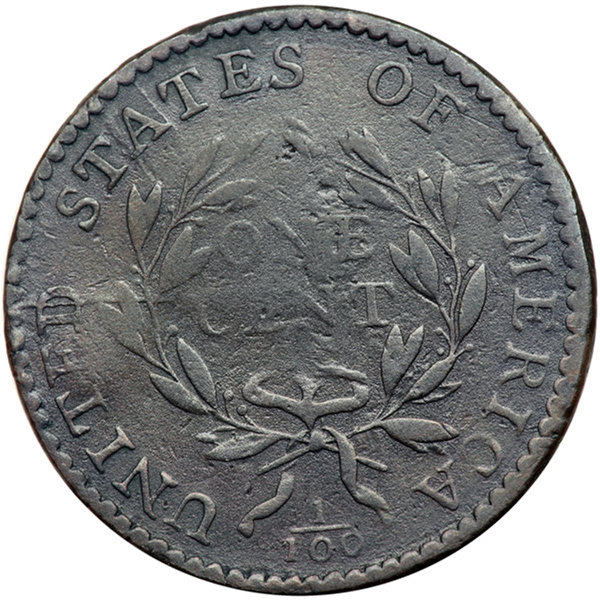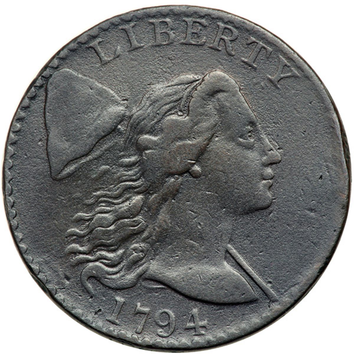 1794 S-41 R3 VG10. Sharpness VF20 but the planchet is covered with uniform microscopic granularity and there is a dull dent on the cap that caused a bulge at the base of the E in UNITED. No verdigris or additional marks of any significance. Slightly glossy dark steel and olive brown. MDS, Breen state IV. The die crack at the A in STATES does not reach the wreath and minor swelling weakens ON and CEN. The date and remainder of the legends are complete and clear.