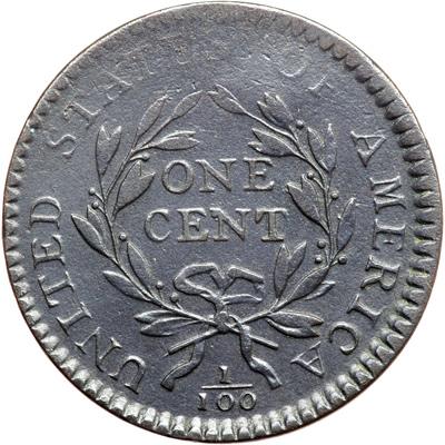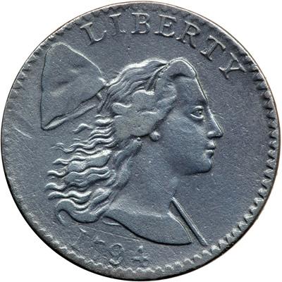 1794 S-42 R4. Fine-12. Sharpness VF20 but the planchet has a very subtle bend from a dull dent across the bottom edge of the bust that caused a barely visible bulge under OF. The only other mark on this cent is a shallow dent in the field left of the bottom edge of the cap and a faint hairline scratch above the date. The planchet is covered with uniform extremely faint granularity that's mostly hidden under a glossy very dark steel patina. The date and legends are complete and easily readable. LDS, Breen state II, with die clashmarks behind the head.