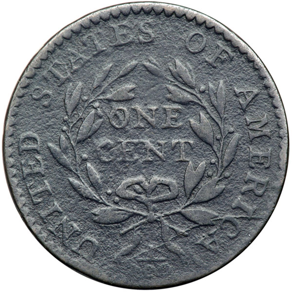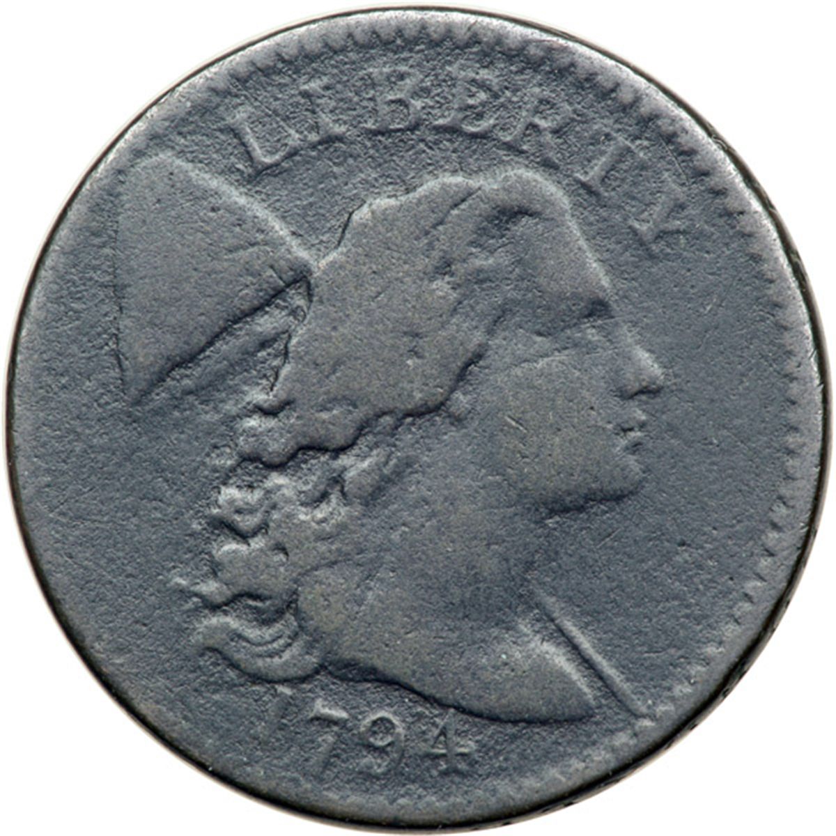1794 S-45 R5+ VG7. Slightly sharper but the fields and protected areas are covered with uniform very fine roughness while the devices are smooth. No marks or verdigris. Rather glossy dark steel brown and olive. The date and legends are complete and clear. Rare LDS, Breen state II late, with a strong die crack arcing through IC in AMERICA and the fraction.