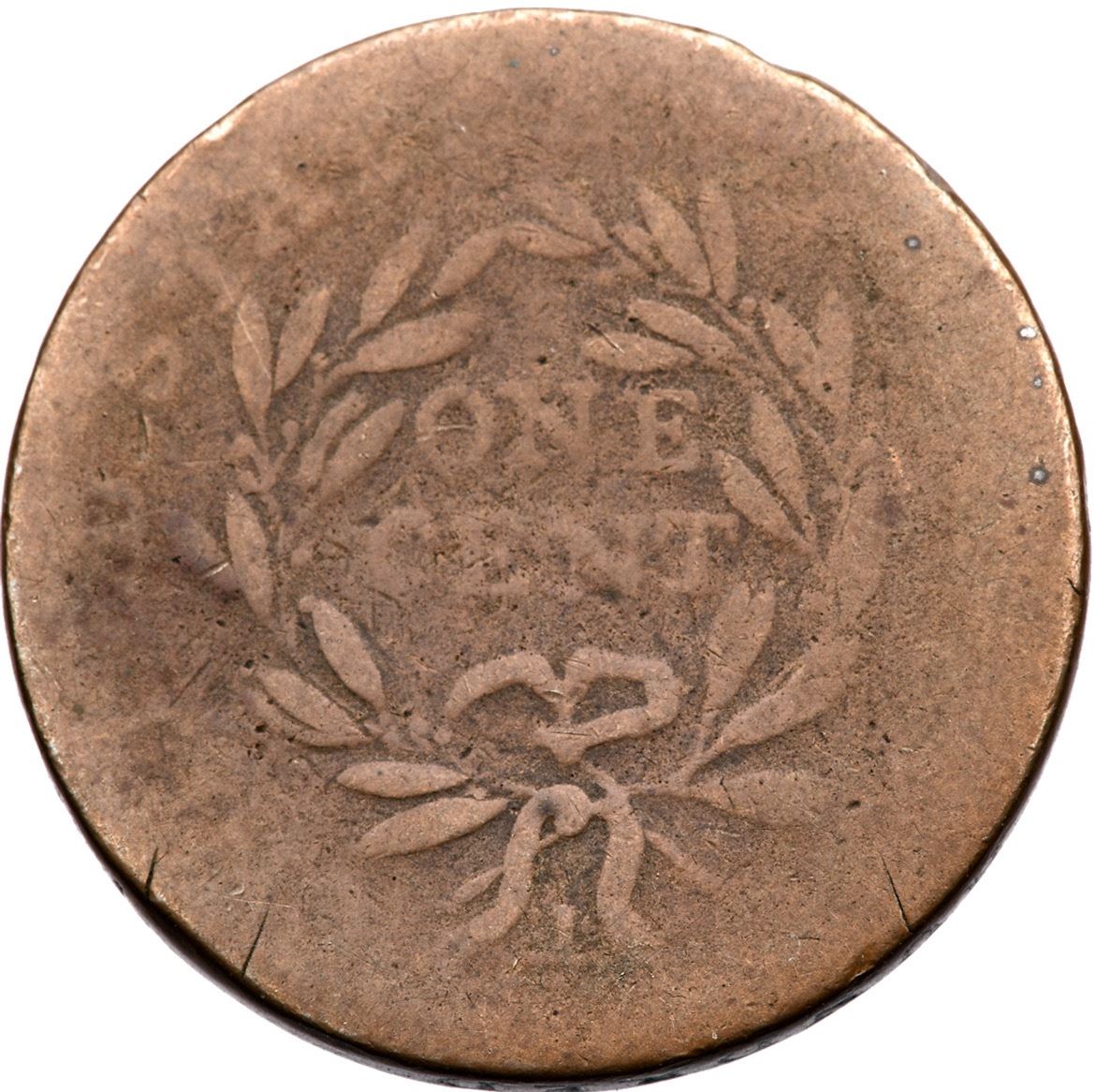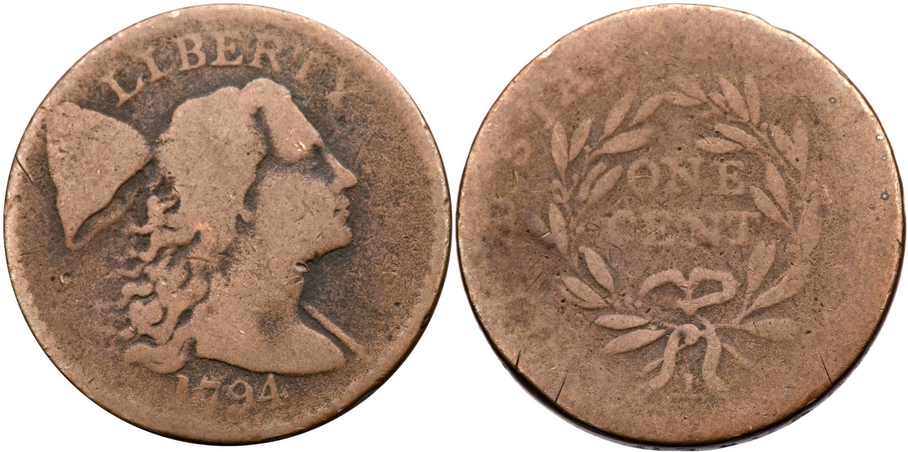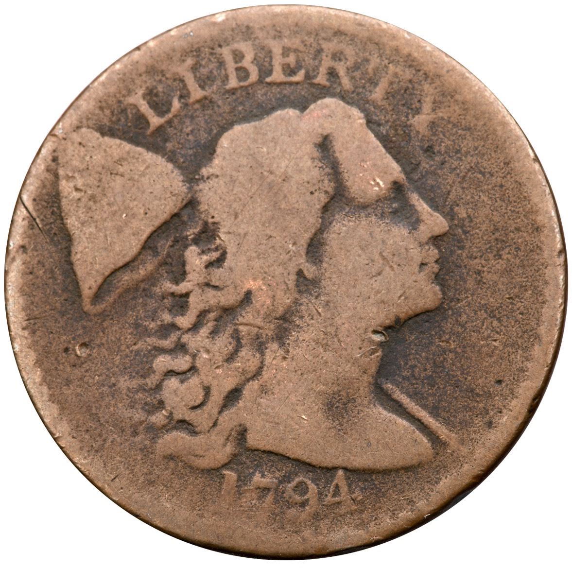 1794 S-51 R-4 G4The obverse is a bit better than the reverse, perhaps a 5/2+ split (the reverse is always weaker on this variety). Mostly glossy light brown with light chocolate in the fields and protected areas. No roughness or notable marks, basically just a worn cent. EDS with no die cracks on the obverse. The date and LIBERTY are easily readable and about half of the legends on the reverse remain visible.Ex; Chris Young - Roxanne Himmelstein Collection Early Cents Auctions 6/2023:202 - Dennis Fuoss